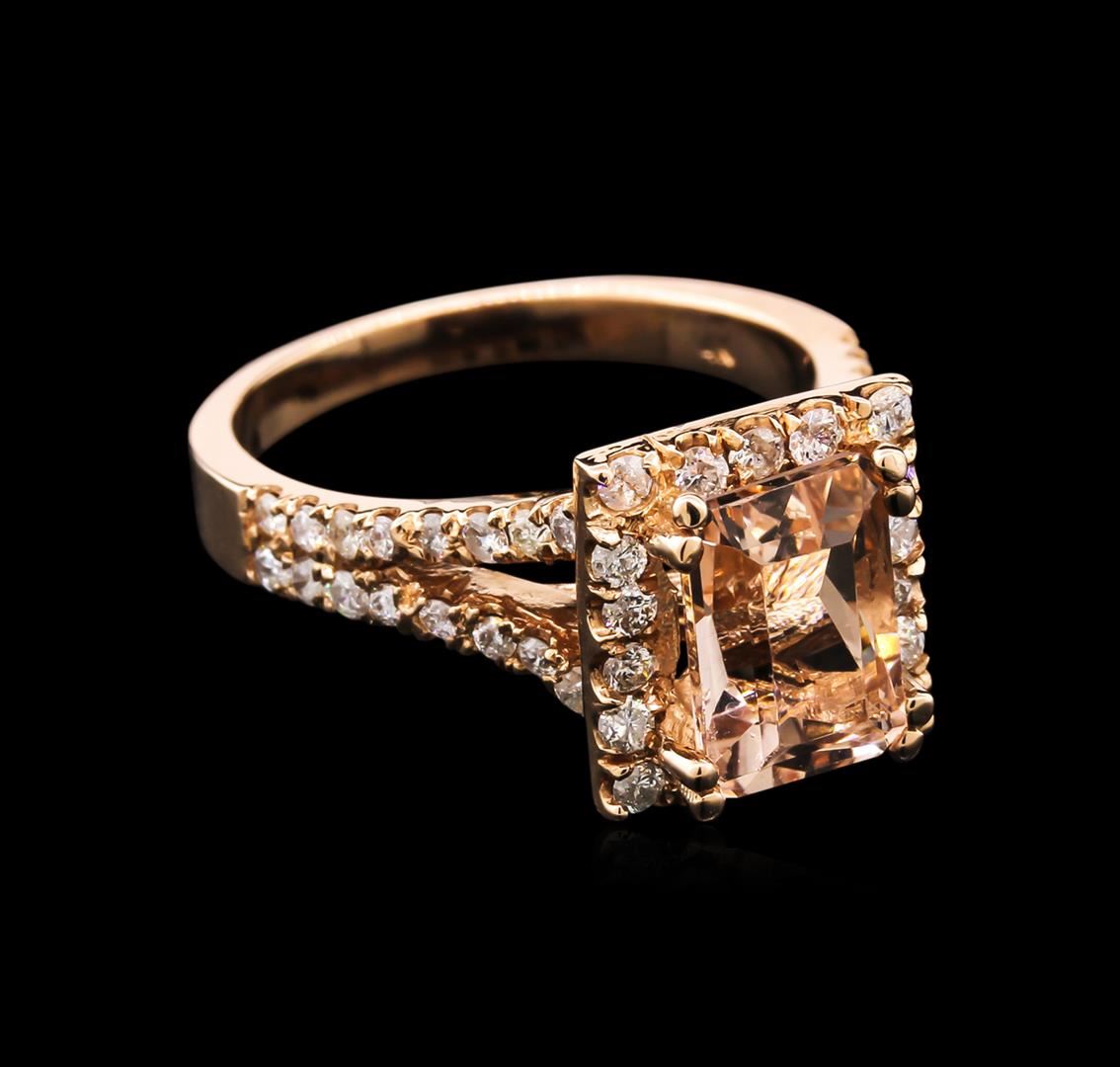 One electronically tested 14KT rose gold lady's cast fashion ring with a split shank with a bright polish finish. The featured lady's ring has a shank measuring 2.36 millimeters wide. Identified with markings of "14K". Condition is new, good workmanship. Containing: One prong set rectangular modified mixed cut natural morganite, measuring 9.04 x 6.30 x 5.14mm, approximate weight of 2.15ct., clarity is eye clean, type I, light, very slightly brownish, reddish orange color, (GIA rO 3/3), cut is very good. Transmitting light with no distortion, transparent. Colored gemstones are presumed to have been subjected to commonly used enhancement processes. Graded in the setting. Fifty prong set round brilliant cut diamonds, measuring 1.60 - 1.50 x 0.98mm (depth est.) approximate total weight of 50 Stones = 0.72ct. Graded in the setting. Clarity: SI-2 to I-1. Color: G - I. Cut Good. Total Weight of Colored Stones 2.15ct. Total Weight of Diamonds 0.72ct. Total Weight of Ring 5.70gm. GAS Appraised at $3,745.00.