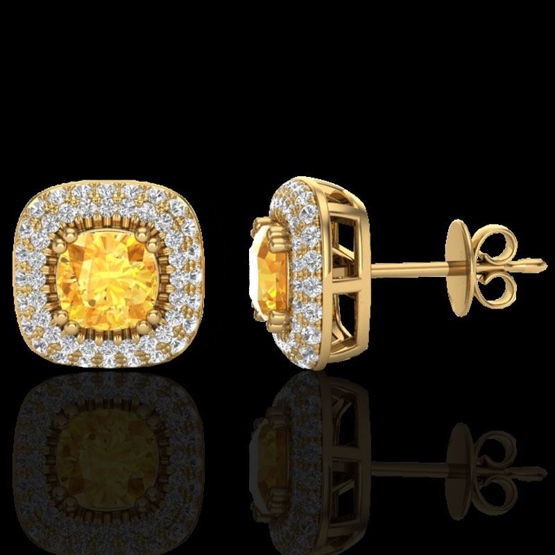 REF-99W3F -20340 ---- 2.16 CTW Citrine & Micro VS/SI Diamond Earrings Double Halo 18K Yellow Gold ---- Luxury Designer Brand Earring Appraised at $7,100 Certificate Number US20340 18k Yellow gold, Earring Size is 1/2 Inches, Earring measuring approx. 1/2" x 1/2" , weighing in total approx. 5 grams. Made in the USA and is stamped 18k, Main stone 1.2 carat total weight containing 2 pieces of Translucent Yellow color with AAA quality Cushion shape cut Citrine , Stone #2 0.96 carat total weight containing 96 pieces of H-I color with VS/SI quality Round shape cut Diamond