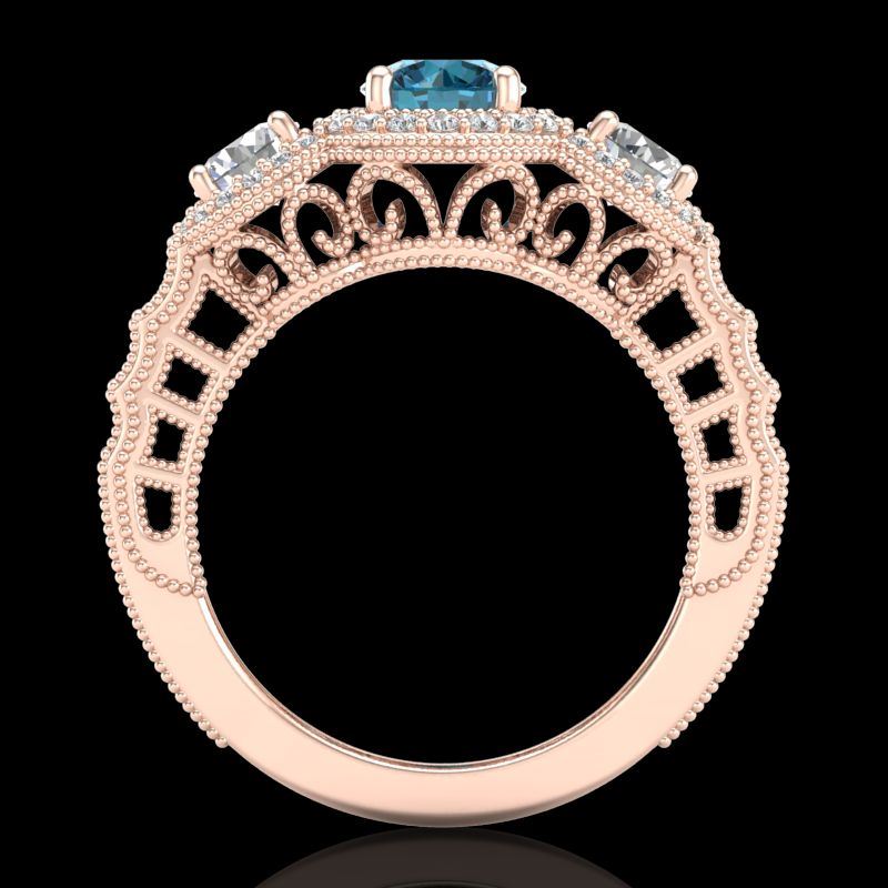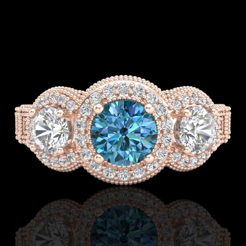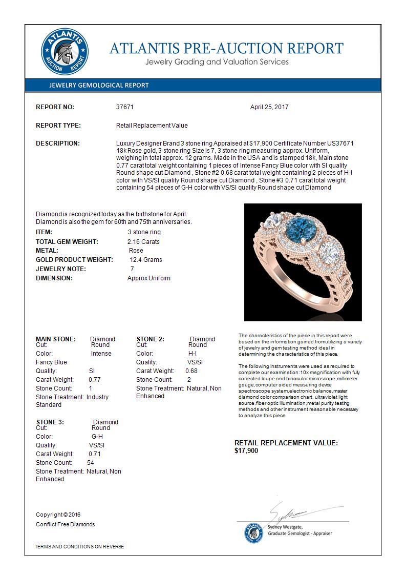 2.16 CTW Intense Blue Diamond Solitaire Art Deco 3 Stone Ring 18K Rose Gold ---- Luxury Designer Brand 3 stone ring Appraised Retail Price at $17,900 ---- SKU Number US37671 18k Rose gold 3 stone ring Size is 7, 3 stone ring measuring approx. Uniform, weighing in total approx. 12 grams. Made in the USA and is stamped 18k, Main stone 0.77 carat total weight containing 1 pieces of Intense Fancy Blue color with SI quality Round shape cut Diamond , Stone #2 0.68 carat total weight containing 2 pieces of H-I color with VS/SI quality Round shape cut