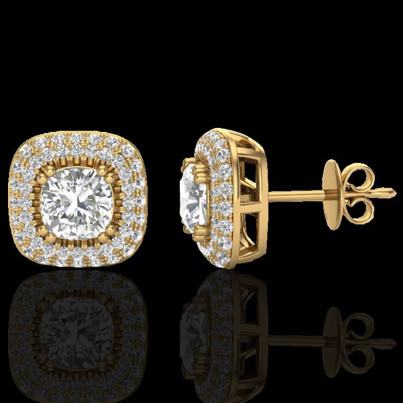 REF-250M2H -20343 ---- 2.16 CTW Micro Pave VS/SI Diamond Earrings Solitaire Double Halo 18K Yellow Gold ---- Luxury Designer Brand Earring Appraised at $11,000 Certificate Number US20343  18k Yellow gold,  Earring Size is 1/2 Inches, Earring measuring approx. 1/2" x 1/2" , weighing in total approx. 5 grams. Made in the USA and is stamped 18k, Main stone 1.2 carat total weight containing 2 pieces of H-J color with VS/SI quality Cushion shape cut Diamond , Stone #2 0.96 carat total weight containing 96 pieces of H-I color with  VS/SI quality Round shape cut Diamond