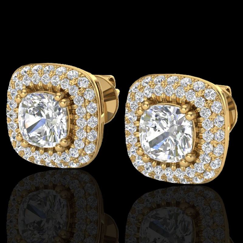 2.16 CTW Micro Pave VS/SI Diamond Earrings Solitaire Double Halo 18K Yellow Gold ---- Luxury Designer Brand Earring Appraised Retail Price at $11,000 ---- SKU Number US20343 18k Yellow gold Earring Size is 1/2 Inches, Earring measuring approx. 1/2" x 1/2" , weighing in total approx. 5 grams. Made in the USA and is stamped 18k, Main stone 1.20 carat total weight containing 2 pieces of H-J color with VS/SI quality Cushion shape cut Diamond , Stone #2 0.96 carat total weight containing 96 pieces of H-I color with VS/SI quality Round shape cut