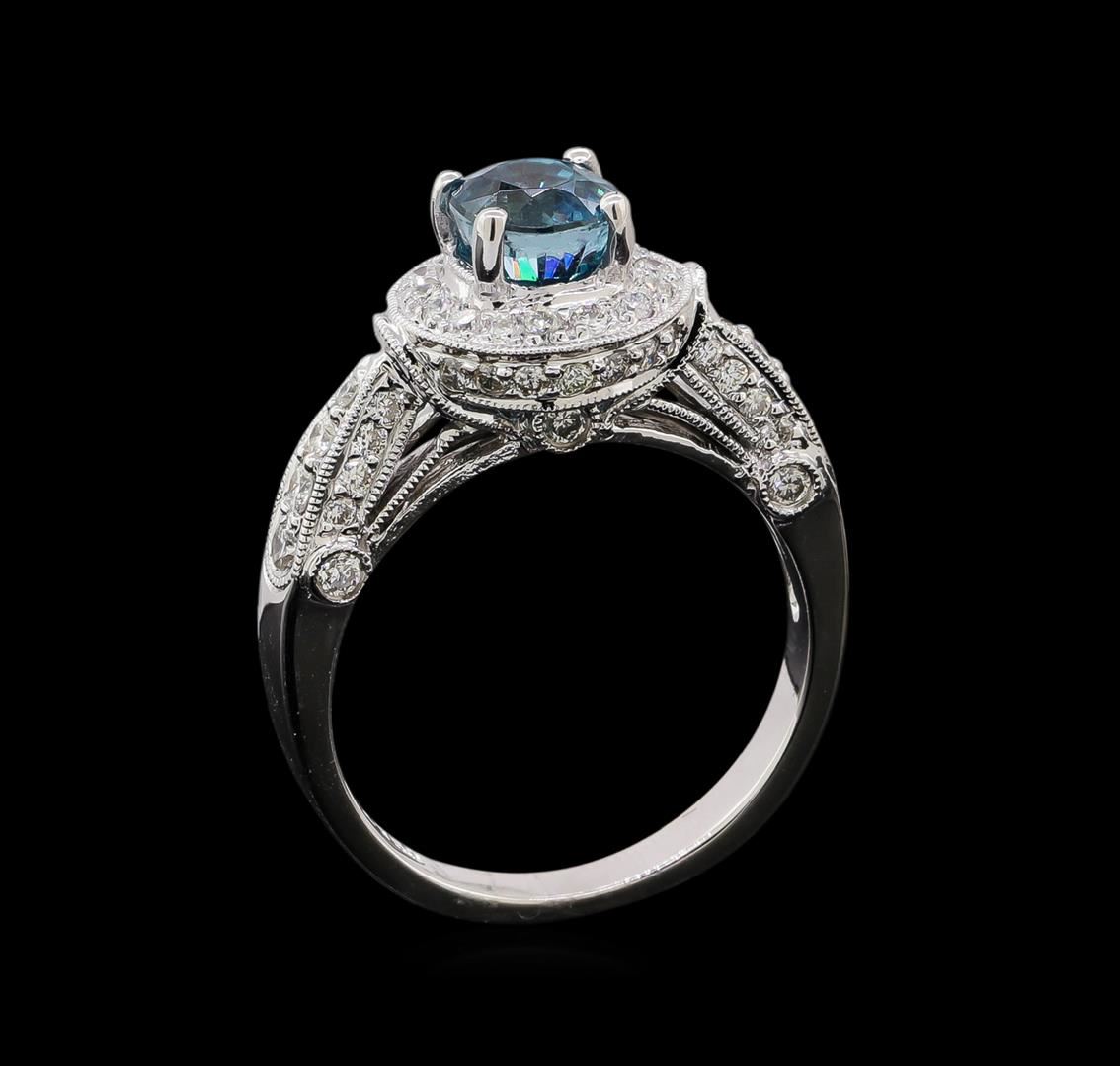 One electronically tested 18KT white gold ladies cast blue zircon and diamond ring. The featured blue zircon is set within a diamond bezel supported by a diamond accented under gallery and stylized diamond set shoulders, completed by a two millimeter wide band. Bright polish finish with milgrain detailing. Identified with markings of '18K 750'. Condition is new, good workmanship. Containing: One prong set oval mixed cut natural blue zircon, measuring 6.90 x 5.90 x 4.70mm, 10%. bulge factor, approximate weight of 2.16ct., clarity is eye clean, type I, medium, moderately strong, very strongly greenish blue color, (GIA vstgB 5/4), cut is good. Transmitting light with no distortion, transparent. Graded in the setting. Sixty prong set round brilliant cut diamonds, measuring 1.60 - 1.30 x 0.87mm (depth est.) approximate total weight of 60 Stones = 0.73ct. The clarity grade reflects the entire range of clarity for this group. Graded in the setting. Clarity SI-1 to I-2. Color: F - H. Total Weight of Colored Stones 2.16ct.. Total Weight of Diamonds 0.73ct.. Total Weight of Ring 6.75gm. AIG Appraised at $4,545.00.