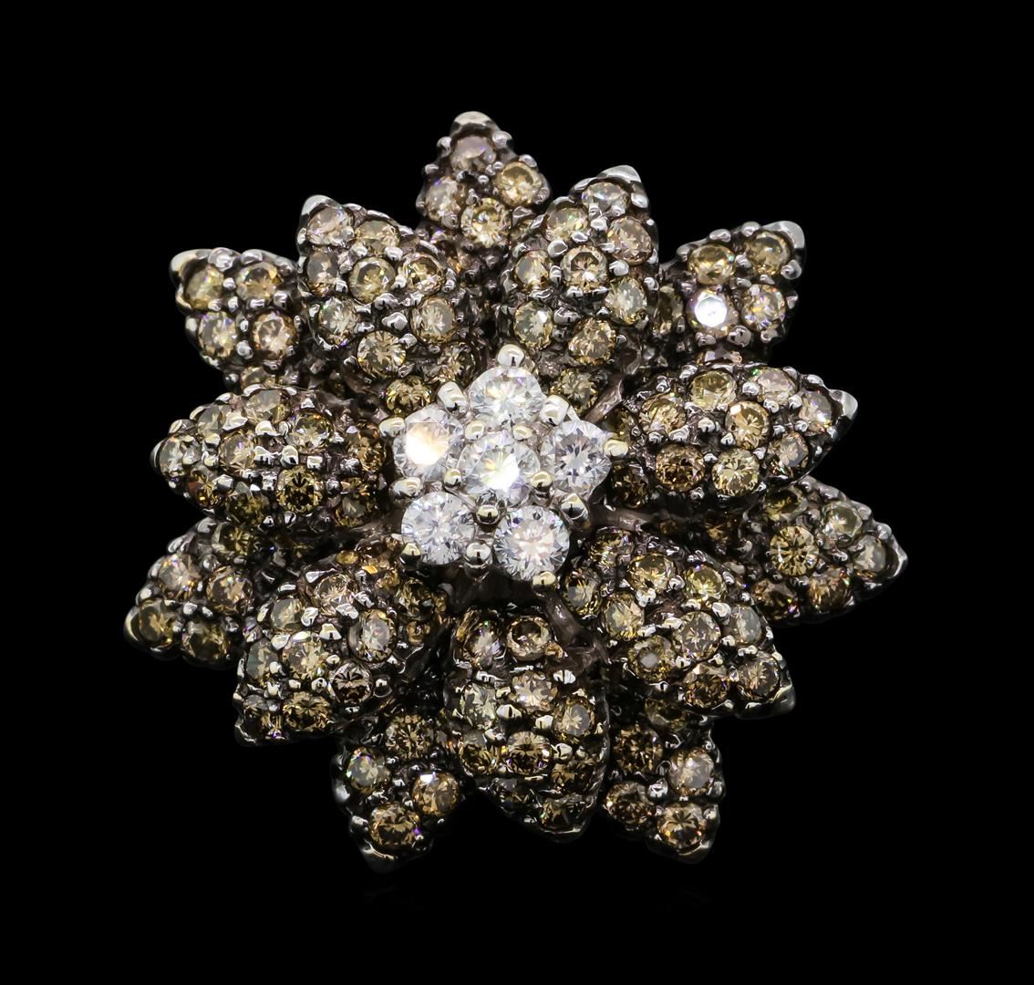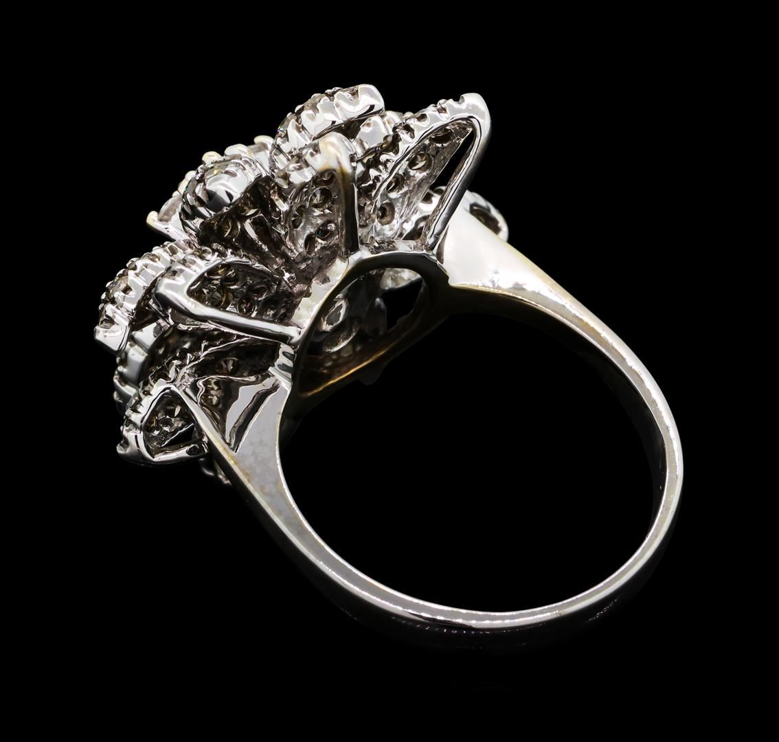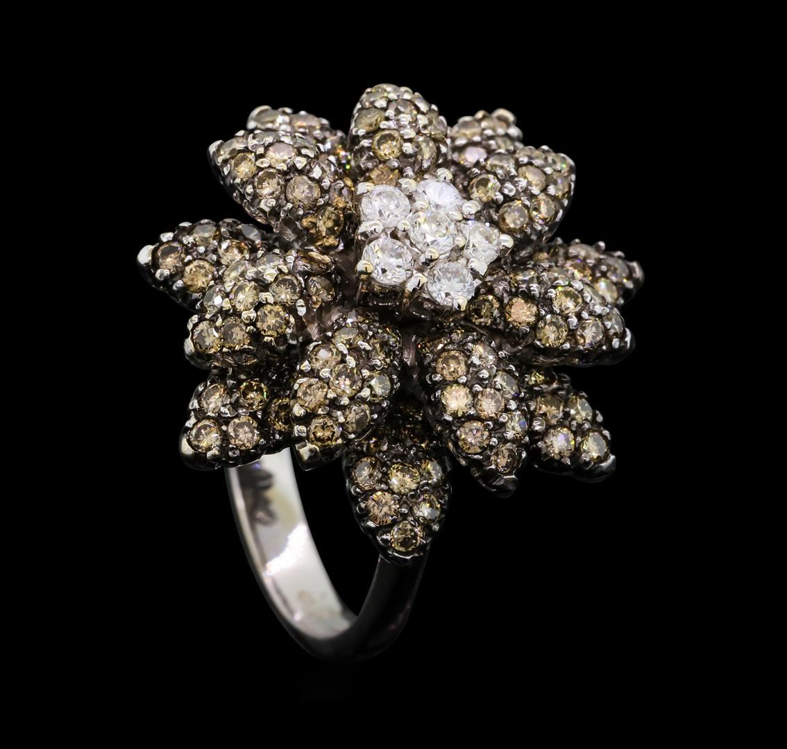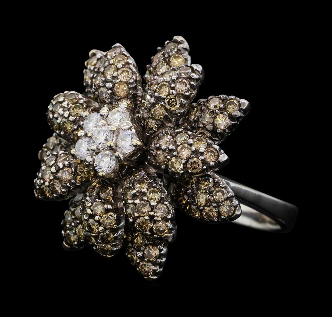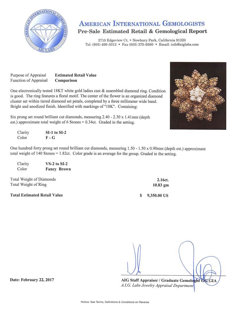 One electronically tested 18KT white gold ladies cast & assembled diamond ring. The ring features a floral motif. The center of the flower is an organized diamond cluster set within tiered diamond set petals, completed by a three millimeter wide band. Bright and anodized finish. Identified with markings of '18K'. Condition is good. Containing: Six prong set round brilliant cut diamonds, measuring 2.40 - 2.30 x 1.41mm (depth est.) approximate total weight of 6 Stones = 0.34ct. Graded in the setting. Clarity SI-1 to SI-2. Color: F - G One Hundred Forty prong set round brilliant cut diamonds, measuring 1.50 - 1.50 x 0.90mm (depth est.) approximate total weight of 140 Stones = 1.82ct. Color grade is an average for the group. Graded in the setting. Clarity VS-2 to SI-2. Total Weight of Diamonds 2.16ct.. Total Weight of Ring 10.83gm. AIG Appraised at $9,350.00.