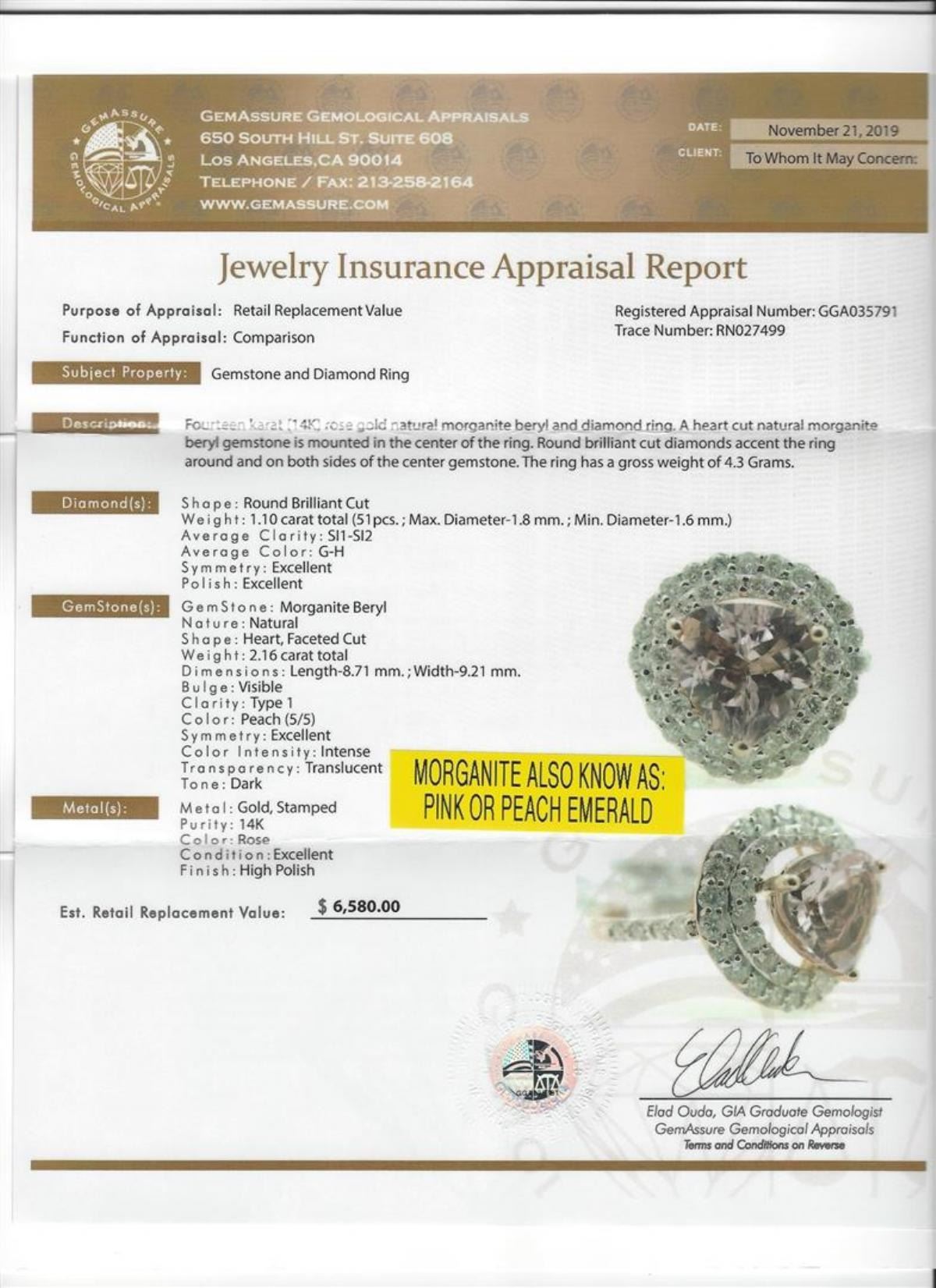One 2.16ct Morganite and Diamond Ring - 14KT Rose Gold . GGA certified. See Appraisal for more details. GGA Appraised.