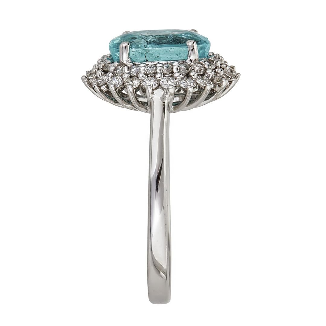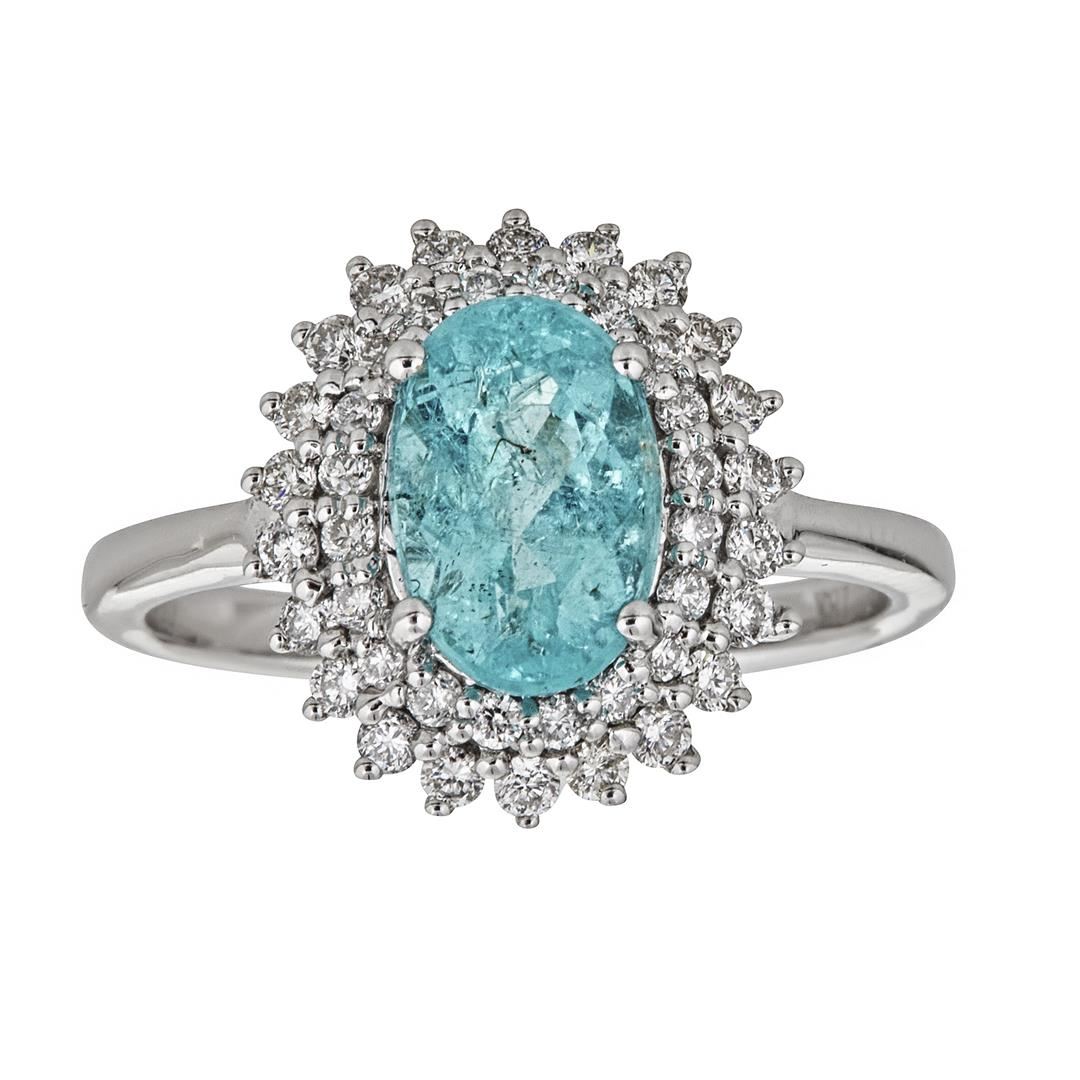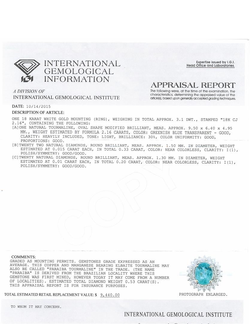 One 18KT white gold ring, weighing in total approx. 3.1 dwt., stamped "18K CJ 2.16", containing the following: One natural paraiba tourmaline, oval shape modified brilliant, measuring approx. 9.50 x 6.40 x 4.95 mm, weight estimated by formula 2.16ct, color: greenish blue transparent - good, clarity: heavily included, tone: light, brilliance: 30%, color uniformity: good, proportions: good. Twenty two natural diamonds, round brilliant, measuring approx. 1.50 mm in diameter, weight estimated at 0.015ct each, in total 0.33ct, color: near colorless, clarity: I1, polish/symmetry: good/good. Twenty natural diamonds, round brilliant, measuring approx. 1.30 mm in diameter, weight estimated at 0.01ct each, in total 0.20ct, color: near colorless, clarity: I1, polish/symmetry: good/good. IGI Appraised at $9,440.00.