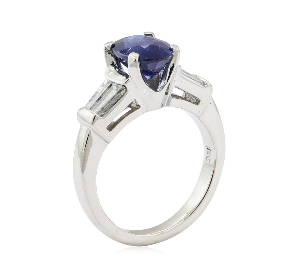 One electronically tested platinum lady's cast fashion ring with a tapered cathedral shank with a bright polish finish. The featured lady's ring has a shank measuring 2.20 millimeters wide. Identified with markings of 'PLAT'. Condition is like new, good workmanship. Containing: One prong set oval modified mixed cut natural blue sapphire, measuring 8.05 x 6.10 x 4.24mm, (depth est.) approximate weight of 1.78ct., clarity is heavily included, medium dark, moderately strong, blue color, (GIA B 6/4), cut is good. Transmitting light somewhat diffusely, semi-transparent to translucent. Colored gemstones are presumed to have been subjected to commonly used enhancement processes. Graded in the setting. Four channel set baguette cut (tapered) diamonds, measuring from 4.30 x 1.60 x 1.37mm (depth est.) to 4.50 x 1.70 x 1.45mm (depth est.) approximate total weight of 4 Stones = 0.38ct. Graded in the setting. Color H - I Clarity VS-1 to VS-2 Cut Very Good. Total Weight of Colored Stones 1.78ct.. Total Weight of Diamonds 0.38ct.. Total Weight of Ring 7.20gm GAS Appraised at $4260.00. GAS Appraised.