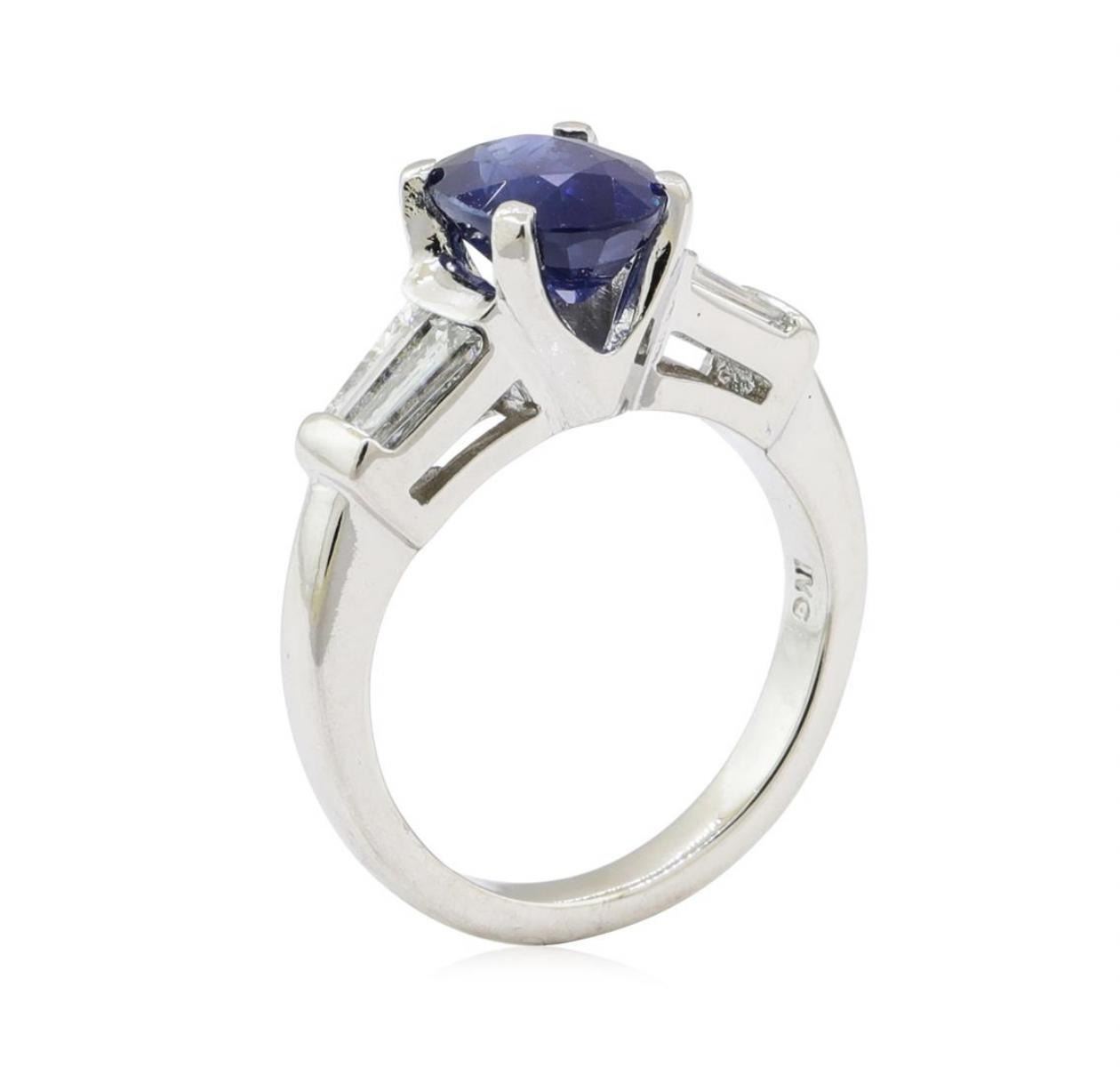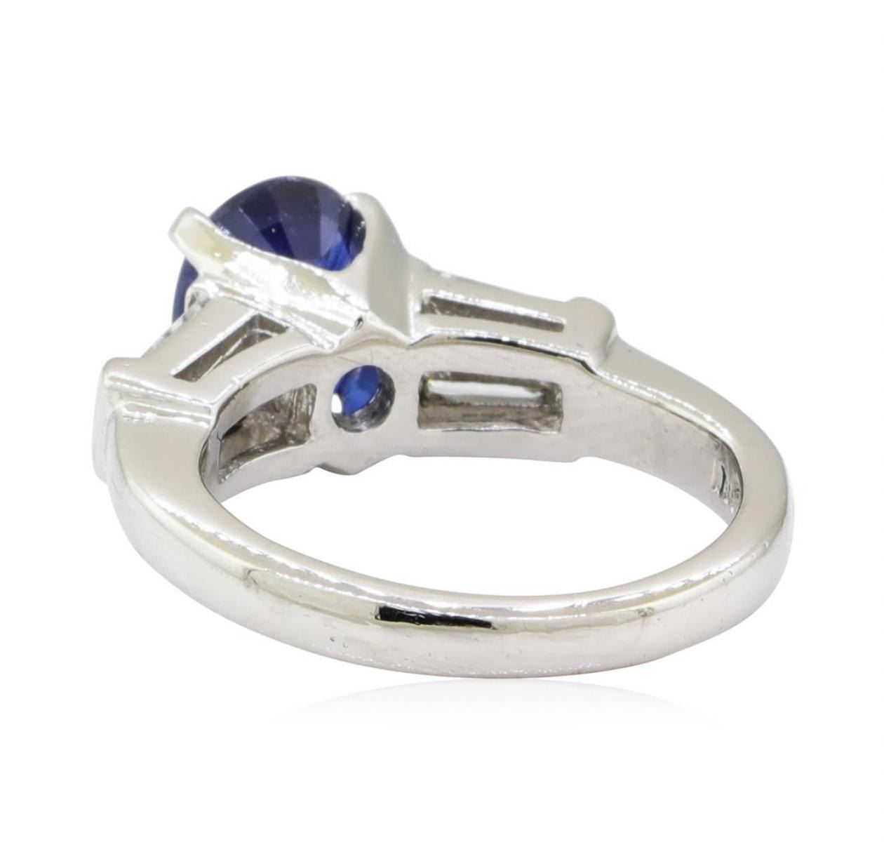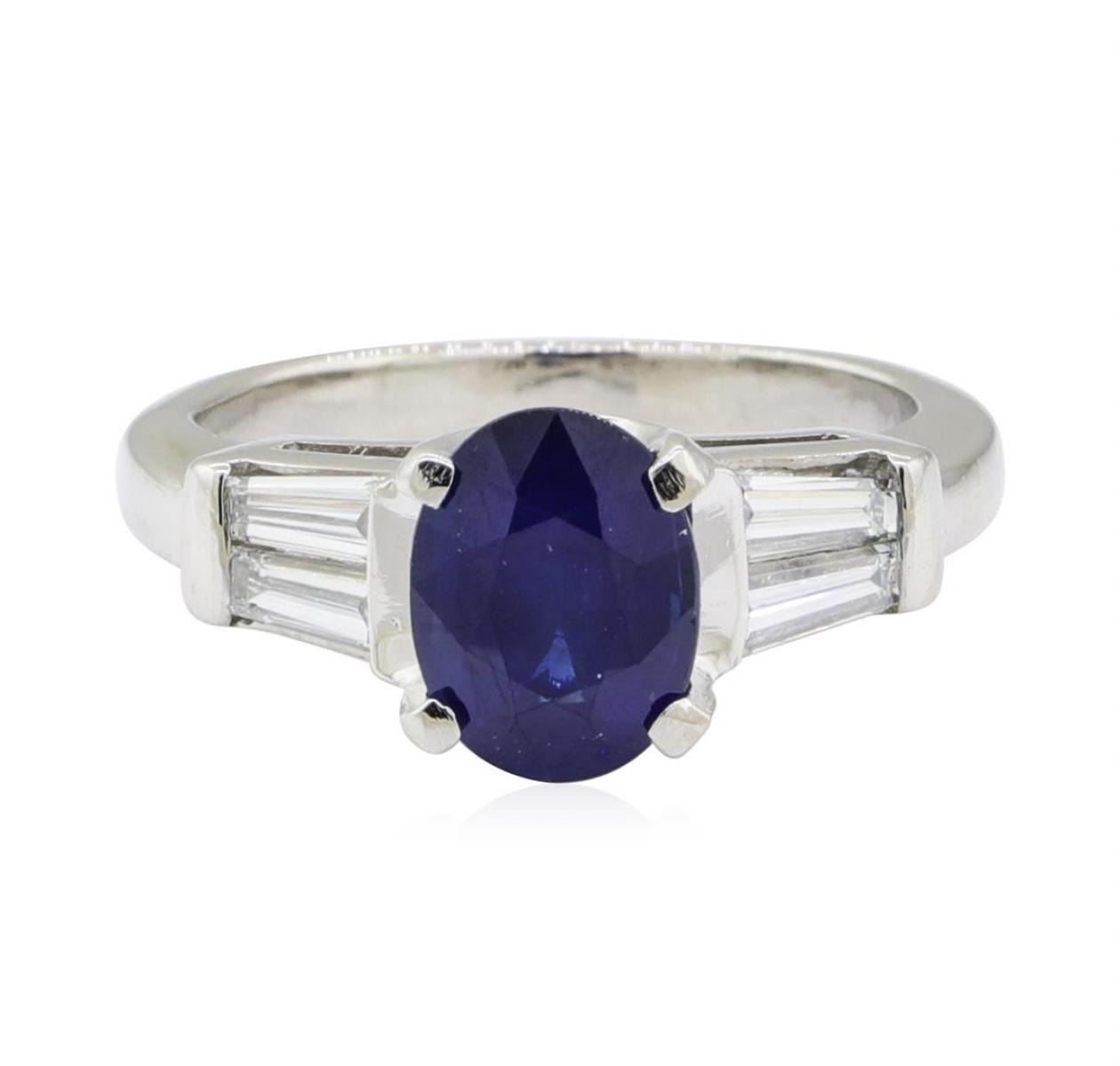 One electronically tested platinum lady's cast fashion ring with a tapered cathedral shank with a bright polish finish. The featured lady's ring has a shank measuring 2.20 millimeters wide. Identified with markings of 'PLAT'. Condition is like new, good workmanship. Containing: One prong set oval modified mixed cut natural blue sapphire, measuring 8.05 x 6.10 x 4.24mm, (depth est.) approximate weight of 1.78ct., clarity is heavily included, medium dark, moderately strong, blue color, (GIA B 6/4), cut is good. Transmitting light somewhat diffusely, semi-transparent to translucent. Colored gemstones are presumed to have been subjected to commonly used enhancement processes. Graded in the setting. Four channel set baguette cut (tapered) diamonds, measuring from 4.30 x 1.60 x 1.37mm (depth est.) to 4.50 x 1.70 x 1.45mm (depth est.) approximate total weight of 4 Stones = 0.38ct. Graded in the setting. Color H - I Clarity VS-1 to VS-2 Cut Very Good. Total Weight of Colored Stones 1.78ct.. Total Weight of Diamonds 0.38ct.. Total Weight of Ring 7.20gm GAS Appraised at $4260.00. GAS Appraised.