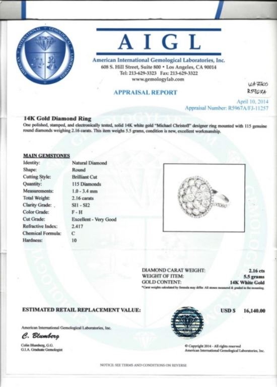 Estimated Retail Replacement Value: $16,140.00Ref: WAG7200Item no.: ARA7034Specification:Gold Content: Solid 14K White Gold Weight of Item: 5.50 gramsSize: 7Country Made: U.S.A Main Gemstone: Natural Diamond Shape: Round Brilliant-cutQuantity: 115 countTotal Carat Weight: 2.16ctColor Grade: F - HClarity Grade: SI1 - SI2Cut Grade: Very Good Hardness: 10 Great Condition - Shipping notes: We ship 4-10 Business day after the clearance of payment. Tracking numbers are emailed once the package(s) are shipped. Most shipments are sent by FEDEX Priority, UPS Priority, or US PRIORITY MAIL INSURED