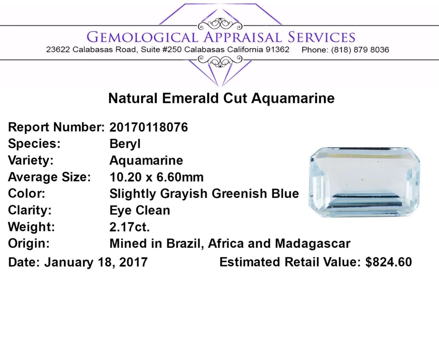 One natural emerald cut aquamarine with an exact weight of 2.17ct., clarity is eye clean, slightly grayish greenish blue. Gemological Appraisals Services estimates the retail value at $824.6 GAS Appraised.