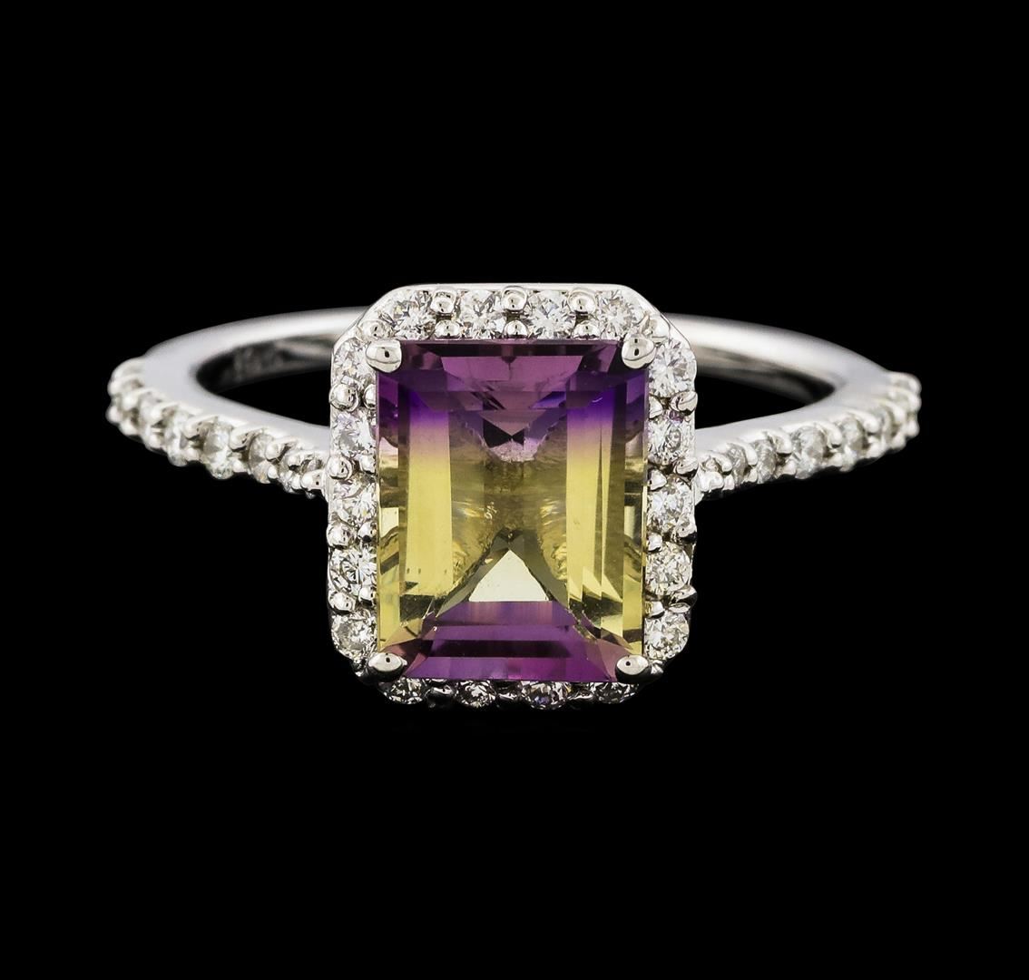 One Ametrine and Diamond Ring featuring: 14KT White Gold with a total weight of 3.82 grams, One Ametrine stone with a total weight of 2.17ct, and 34 Diamonds with a total weight of 0.44ctw.