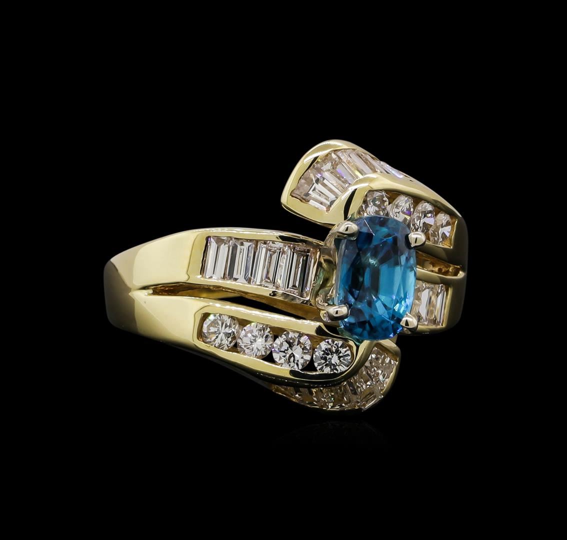 One electronically tested 14KT yellow gold ladies cast & assembled blue zircon and diamond ring with a bright polish finish. The featured blue zircon is set within bypassing diamond ribbons supported by tapering split shoulders, completed by a two millimeter wide band. Identified with markings of '14K'. Condition is new, good workmanship. Containing: One prong set rectangular cushion mixed cut natural blue zircon, measuring 7.50 x 5.00 x 5.00mm, 5%. bulge factor, approximate weight of 2.17ct., clarity is eye clean, type I, medium dark, moderately strong, very strongly greenish blue color, (GIA vstgB 6/4), cut is good. Transmitting light with no distortion, transparent. Graded in the setting. Eight channel set round brilliant cut diamonds, measuring 2.50 - 2.30 x 1.44mm (depth est.) approximate total weight of 8 Stones = 0.44ct. Graded in the setting. Clarity SI-1 to SI-2. Color: F - H Eighteen channel set baguette cut (tapered) diamonds, measuring from 2.50 x 1.50 x 1.05mm (depth est.) to 3.30 x 1.80 x 1.26mm (depth est.) approximate total weight of 18 Stones = 0.93ct. Graded in the setting. Clarity SI-1 to I-1. Color: G - H. Total Weight of Colored Stones 2.17ct.. Total Weight of Diamonds 1.37ct.. Total Weight of Ring 8.81gm. AIG Appraised at $6,330.00.