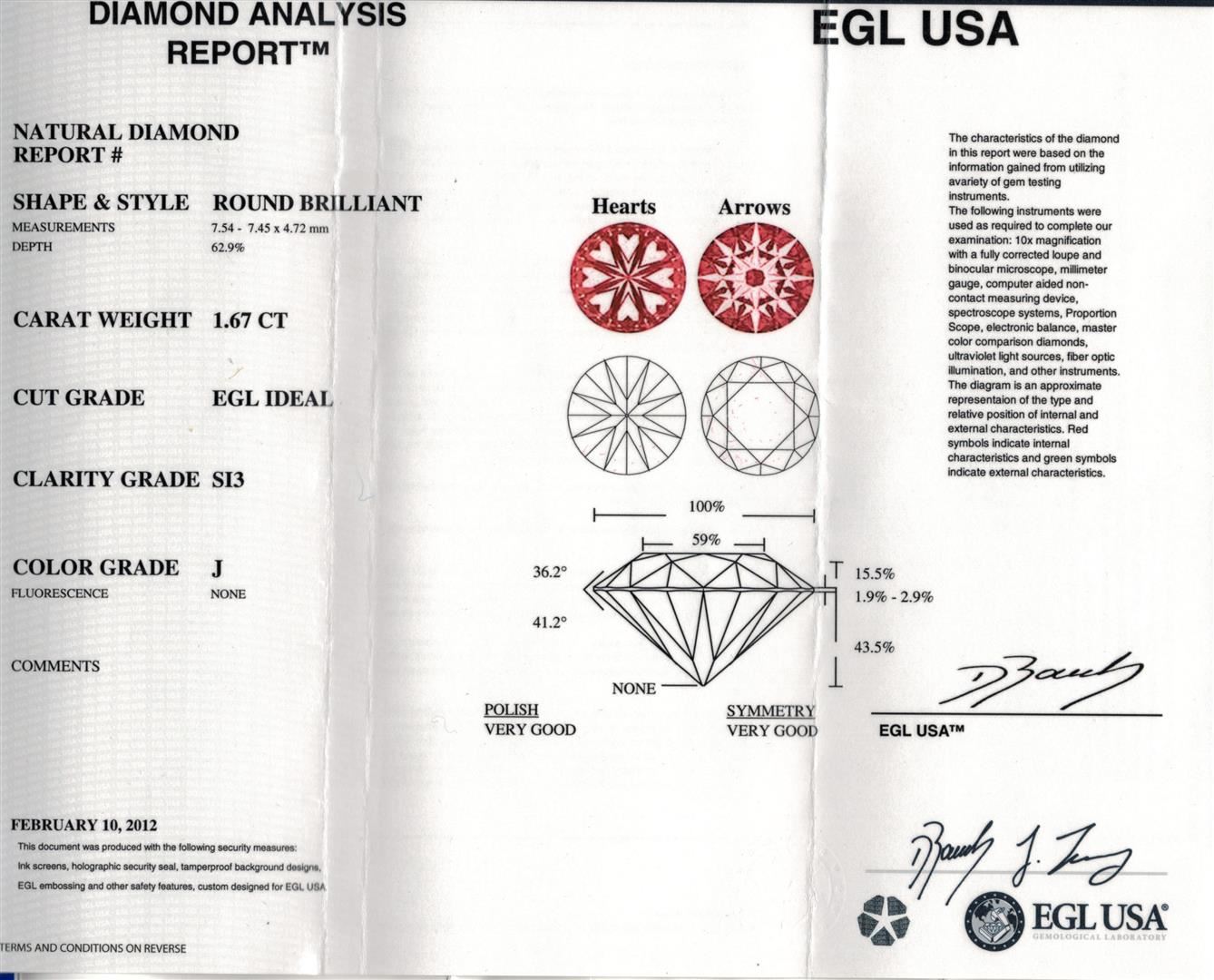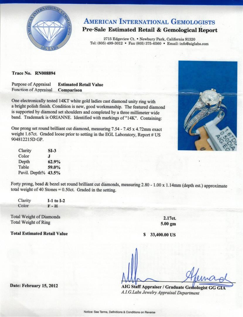 One electronically tested 14KT white gold ladies cast diamond unity ring with a bright polish finish. Condition is new, good workmanship. The featured diamond is supported by diamond set should and completed by a three millimeter wide band. Trademark is Orianne. Identified with markings of "14K". Containing: One prong set round brilliant cut diamond, measuring 7.54 - 7.45 x 4.72mm exact weight of 1.67ct. Graded loose prior to setting in the EGL Laboratory, Report # US904812215D GP. Clarity of SI-3, color of J, 62.9% depth, 59.0% table, 43.5% pavilion depth, and EGL Ideal cut. Forty prong, bead and bezel set round brilliant cut diamonds, measuring 2.80 - 1.00 x 1.14 (depth est.) approximate total weight of 40 Stones = 0.50ct. Graded in the setting. Clarity of I-1 to I-2, color of F-H. Total weight of diamonds is 2.17ctw, total weight of ring is 5.00 grams. AIG appraised at $33,400.00. AIG Appraised.