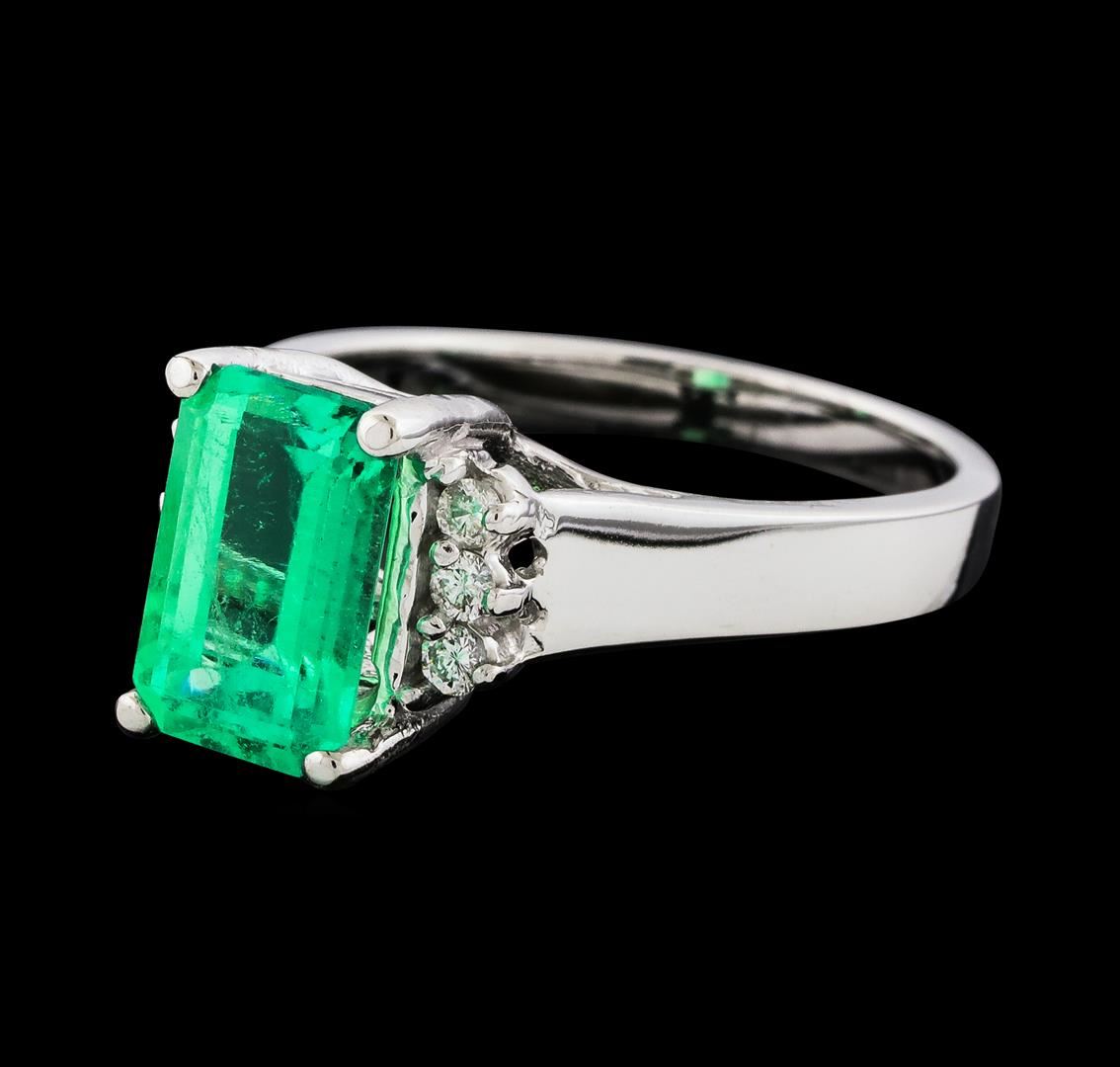 One Emerald and Diamond Ring featuring: 14KT White Gold with a total weight of 5.45 grams, One Emerald stone with a total weight of 2.17ct, and 6 Diamonds with a total weight of 0.16ctw.