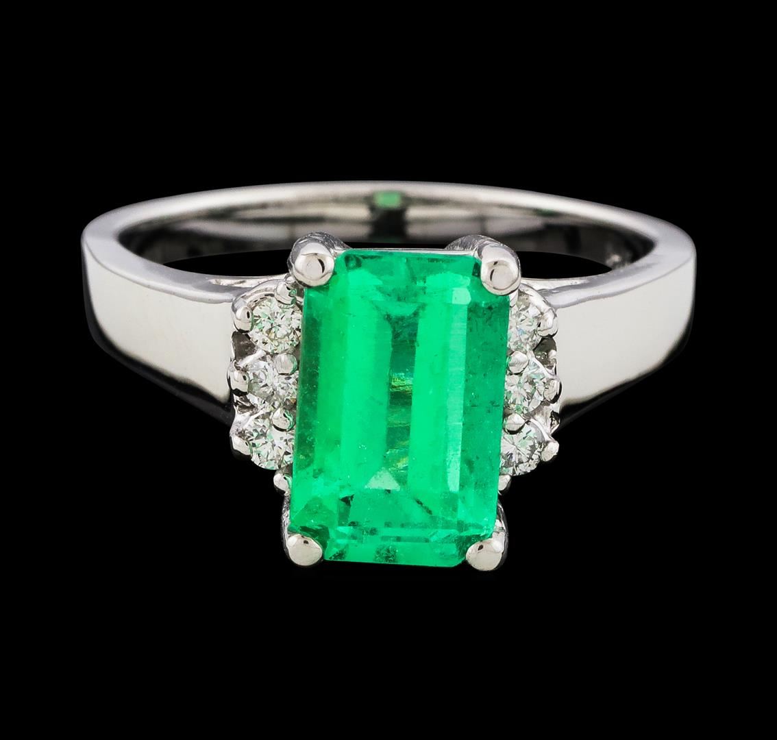One Emerald and Diamond Ring featuring: 14KT White Gold with a total weight of 5.45 grams, One Emerald stone with a total weight of 2.17ct, and 6 Diamonds with a total weight of 0.16ctw.