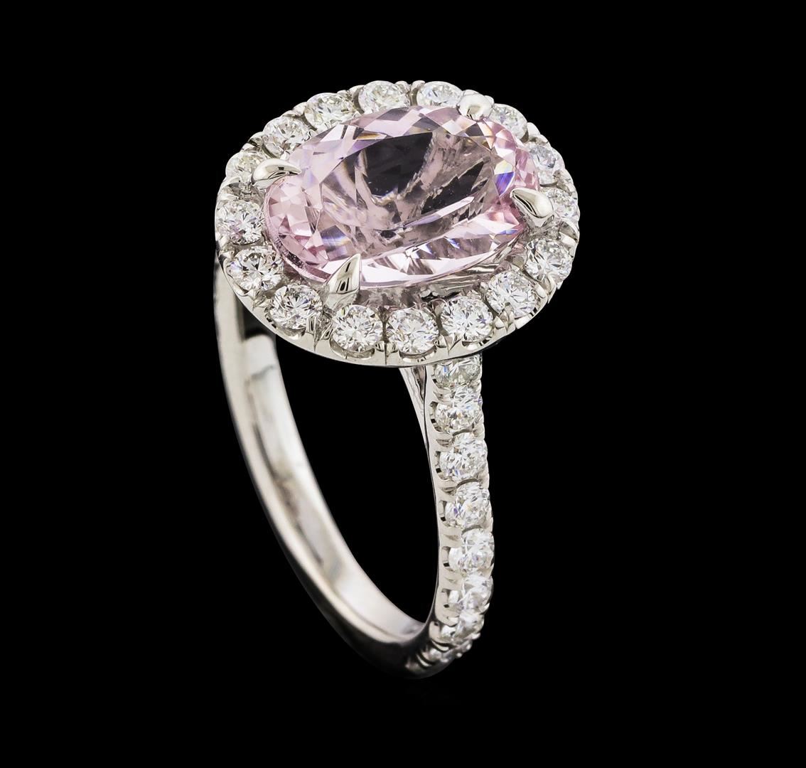 One Morganite and Diamond Ring featuring: 14KT White Gold with a total weight of 3.85 grams, Morganite with a total weight of 2.17ct, and side diamonds with a total weight of 1.00ctw.
