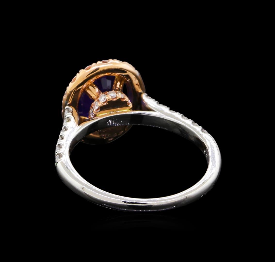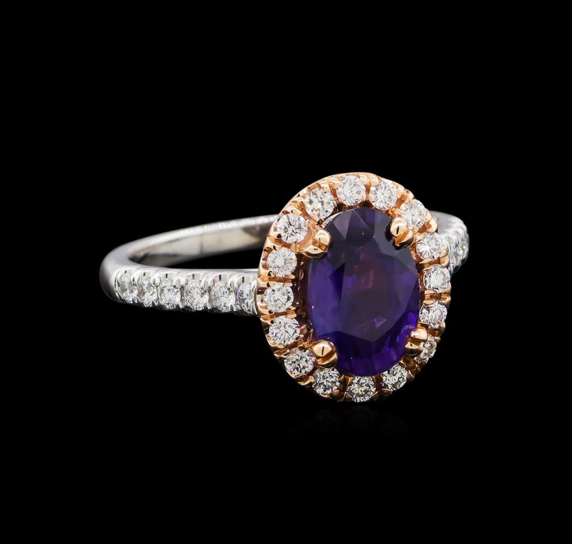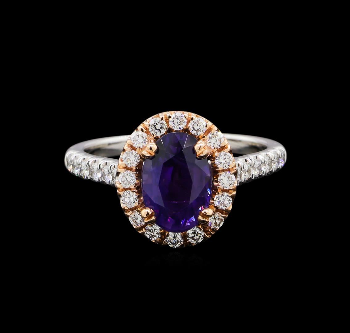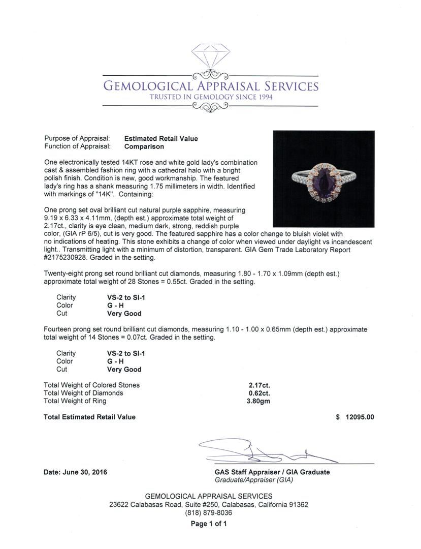 One electronically tested 14KT rose and white gold lady's combination cast & assembled fashion ring with a cathedral halo with a bright polish finish. The featured lady's ring has a shank measuring 1.75 millimeters in width. Identified with markings of "14K". Condition is new, good workmanship. Containing: One prong set oval brilliant cut natural purple sapphire, measuring 9.19 x 6.33 x 4.11mm, (depth est.) approximate total weight of 2.17ct., clarity is eye clean, medium dark, strong, reddish purple color, (GIA rP 6/5), cut is very good. The featured sapphire has a color change to bluish violet with no indications of heating. This stone exhibits a change of color when viewed under daylight vs incandescent light. Transmitting light with a minimum of distortion, transparent. GIA Gem Trade Laboratory Report #2175230928. Graded in the setting. Twenty-Eight prong set round brilliant cut diamonds, measuring 1.80 - 1.70 x 1.09mm (depth est.) approximate total weight of 28 Stones = 0.55ct. Graded in the setting. Clarity: VS-2 to SI-1. Color: G - Very Good Fourteen prong set round brilliant cut diamonds, measuring 1.10 - 1.00 x 0.65mm (depth est.) approximate total weight of 14 Stones = 0.07ct. Graded in the setting. Clarity: VS-2 to SI-1. Color: G - Very Good. Total Weight of Colored Stones 2.17ct. Total Weight of Diamonds 0.62ct. Total Weight of Ring 3.80gm. GAS Appraised at $12,095.00.