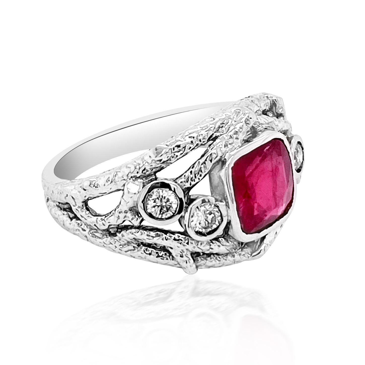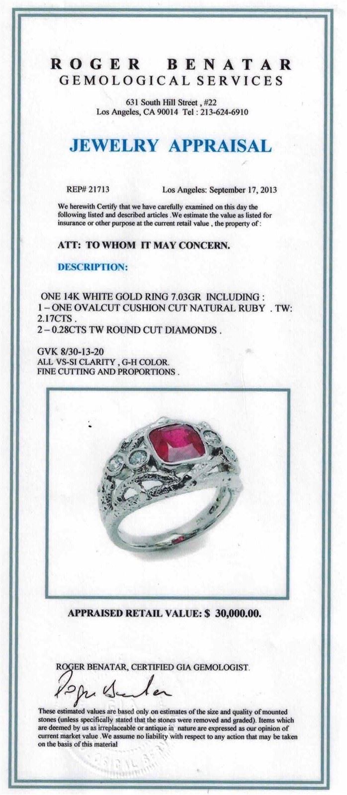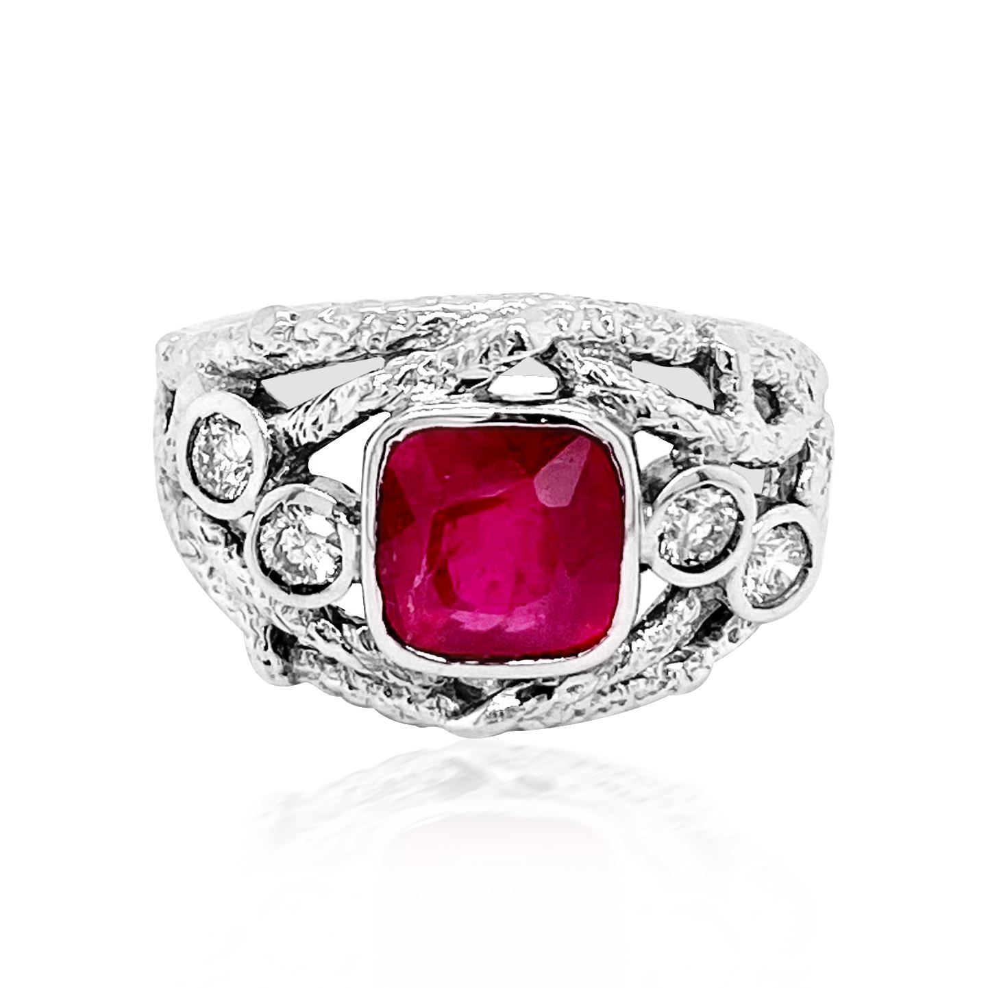 14K WHITE GOLD NATURAL RUBY RING7.03GRAMS/DIAMOND:0.28CT/NATURAL RUBY:2.17CT/#GVR1076/NO LEAD OR GLASS FILLING **Warmly crafted in 14kt white gold, this handsome style features a vibrant red 2.17ct Oval Cut Cushion Cut Natural Ruby center stone, a gemstone of courage, passion and strength. Flanked with inlaid 0.28ct round cut Diamonds, and textured detailing, this ring is an investment piece; a touch of subtle sparkle adds to its richness and depth.**