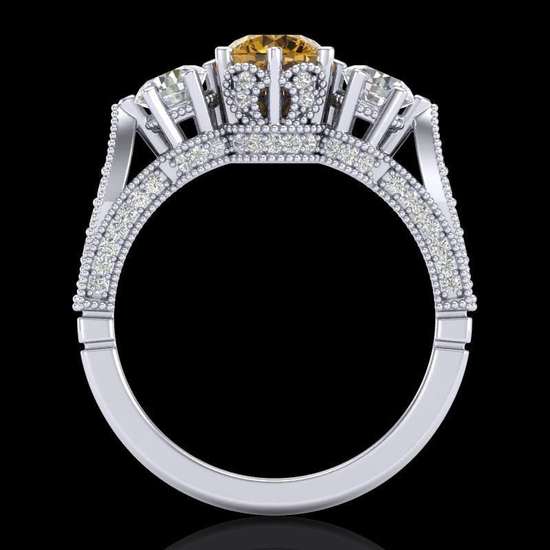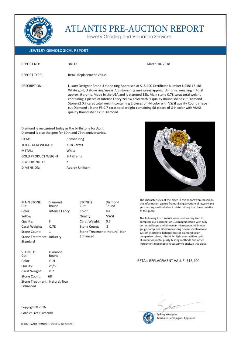 REF-254W5F -38113 ---- 2.18 CTW Intense Fancy Yellow Diamond Art Deco 3 Stone Ring 18K White Gold ---- Luxury Designer Brand 3 stone ring Appraised at $15,400 Certificate Number US38113 18k White gold, 3 stone ring Size is 7, 3 stone ring measuring approx. Uniform, weighing in total approx. 9 grams. Made in the USA and is stamped 18k, Main stone 0.78 carat total weight containing 1 pieces of Intense Fancy Yellow color with SI quality Round shape cut Diamond , Stone #2 0.7 carat total weight containing 2 pieces of H-I color with VS/SI quality Round shape cut Diamond , Stone #3 0.7 carat total weight containing 68 pieces of G-H color with VS/SI quality Round shape cut Diamond