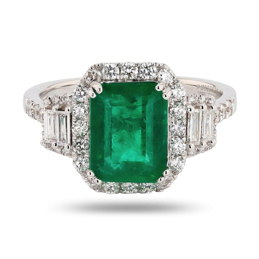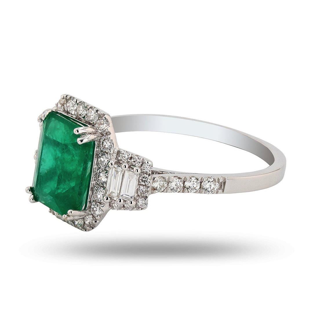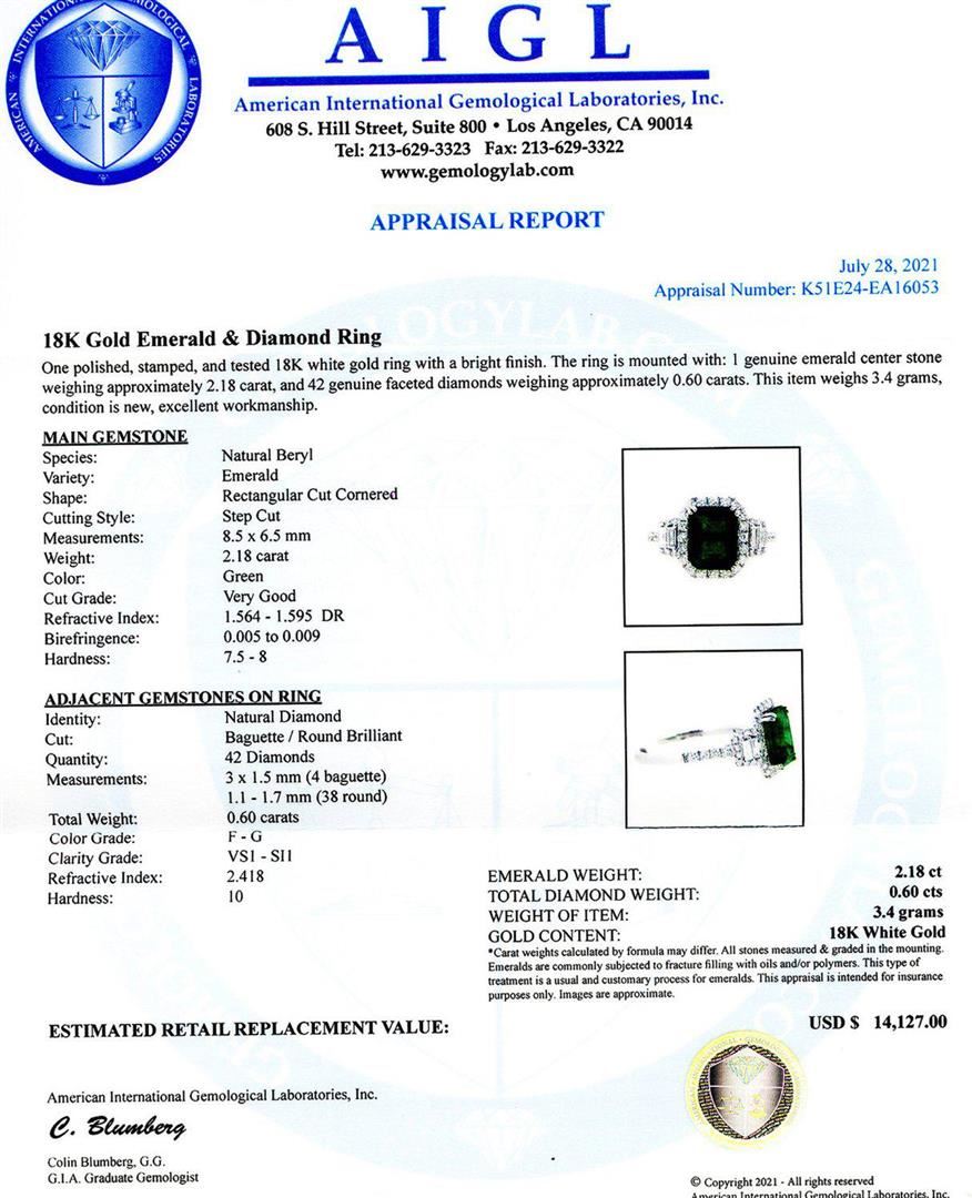 One polished, stamped, and tested 18K white gold ring with a bright finish. The ring is mounted with: 1 genuine emerald center stone weighing approximately 2.18 carat, and 42 genuine faceted diamonds weighing approximately 0.60 carats. This item weighs 3.