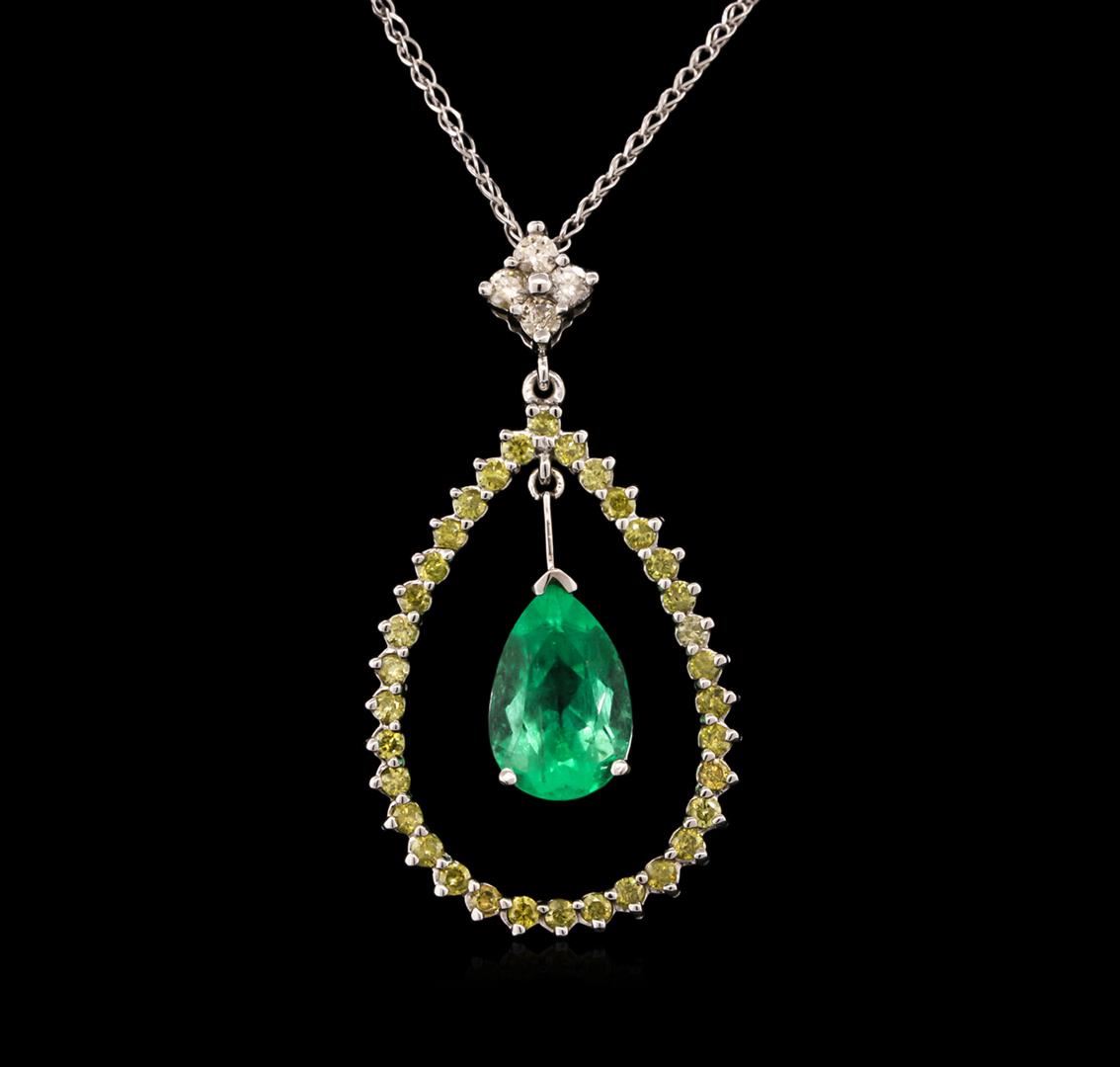 One pendant with chain featuring: 14KT white gold weighing 2.95 grams containing one emerald center stone with a total weight of 2.18ct and 38 diamonds with a total weight of 0.70ct.