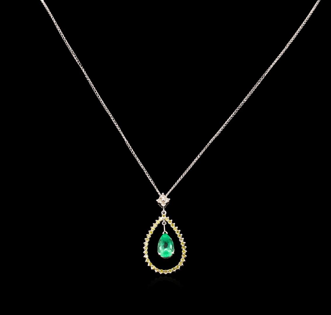 One pendant with chain featuring: 14KT white gold weighing 2.95 grams containing one emerald center stone with a total weight of 2.18ct and 38 diamonds with a total weight of 0.70ct.