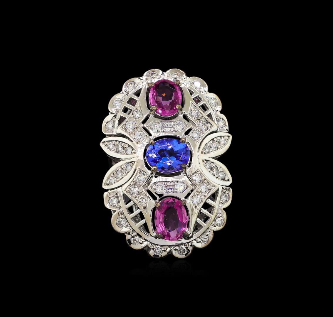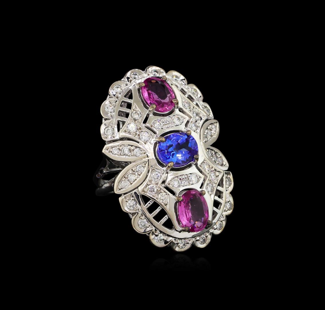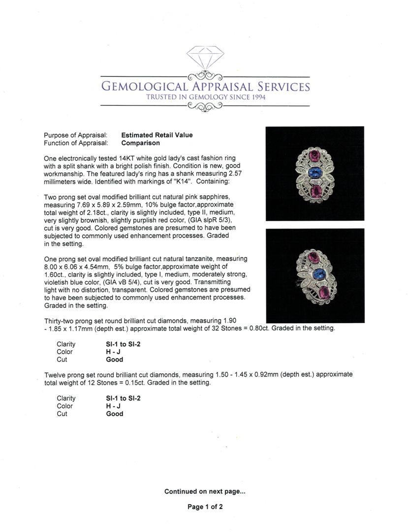 One electronically tested 14KT white gold lady's cast fashion ring with a split shank with a bright polish finish. The featured lady's ring has a shank measuring 2.57 millimeters wide. Identified with markings of "K14". Condition is new, good workmanship. Containing: Two prong set oval modified brilliant cut natural pink sapphires, measuring 7.69 x 5.89 x 2.59mm, 10%. bulge factor, approximate total weight of 2.18ct., clarity is slightly included, type II, medium, very slightly brownish, slightly purplish red color, (GIA slpR 5/3), cut is very good. Colored gemstones are presumed to have been subjected to commonly used enhancement processes. Graded in the setting. One prong set oval modified brilliant cut natural tanzanite, measuring 8.00 x 6.06 x 4.54mm, 5%. bulge factor, approximate weight of 1.60ct., clarity is slightly included, type I, medium, moderately strong, violetish blue color, (GIA vB 5/4), cut is very good. Transmitting light with no distortion, transparent. Colored gemstones are presumed to have been subjected to commonly used enhancement processes. Graded in the setting. Thirty-Two prong set round brilliant cut diamonds, measuring 1.90 - 1.85 x 1.17mm (depth est.) approximate total weight of 32 Stones = 0.80ct. Graded in the setting. Clarity: SI-1 to SI-2. Color: H - Good Twelve prong set round brilliant cut diamonds, measuring 1.50 - 1.45 x 0.92mm (depth est.) approximate total weight of 12 Stones = 0.15ct. Graded in the setting. Clarity: SI-1 to SI-2. Color: H - Good. Total Weight of Colored Stones 3.78ct. Total Weight of Diamonds 0.95ct. Total Weight of Ring 12.50gm. GAS Appraised at $9,930.00.