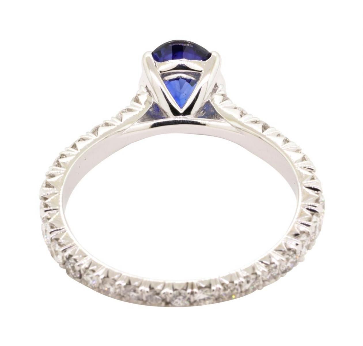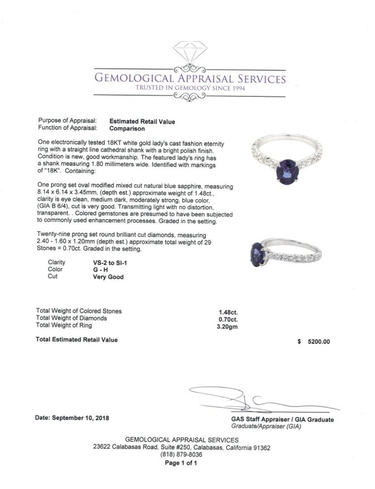 One electronically tested 18KT white gold lady's cast fashion eternity ring with a straight line cathedral shank with a bright polish finish. The featured lady's ring has a shank measuring 1.80 millimeters wide. Identified with markings of '18K'. Condition is new, good workmanship. Containing: One prong set oval modified mixed cut natural blue sapphire, measuring 8.14 x 6.14 x 3.45mm, (depth est.) approximate weight of 1.48ct., clarity is eye clean, medium dark, moderately strong, blue color, (GIA B 6/4), cut is very good. Transmitting light with no distortion, transparent. Colored gemstones are presumed to have been subjected to commonly used enhancement processes. Graded in the setting. Twenty-Nine prong set round brilliant cut diamonds, measuring 2.40 - 1.60 x 1.20mm (depth est.) approximate total weight of 29 Stones = 0.70ct. Graded in the setting. Color G - H Clarity VS-2 to SI-1 Cut Very Good. Total Weight of Colored Stones 1.48ct.. Total Weight of Diamonds 0.70ct.. Total Weight of Ring 3.20gm GAS Appraised at $5200.00. GAS Appraised.