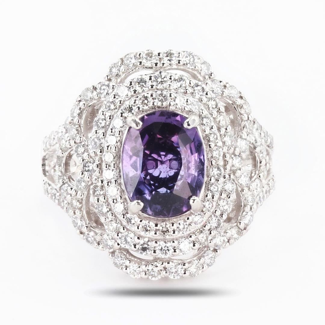 Platinum (PLAT) natural unheated fancy sapphire corundum and diamond ring. An oval modified brilliant cut natural unheated pinkish purple sapphire corundum gemstone is mounted in the center of the ring. Round brilliant cut diamonds accent the ring around and on both sides of the center gemstone. The ring has a gross weight of 11.0 Grams. Trademark is "Oscar Friedman". Reference: GIA Sapphire Report 2231190324 #NATURAL GEMSTONE# GEMSTONE: Sapphire Corundum NATURE: Natural (No Indications of Heating) SHAPE: Oval Modified Brilliant, Faceted Cut WEIGHT: 2.18 carat total DIMENSIONS: 9.10 x 7.14 x 3.70mm CLARITY: Type 3 COLOR: Pinkish Purple (5/5) SYMMETRY: Excellent COLOR INTENSITY: Intense TRANSPARENCY: Transparent TONE: Dark #NATURAL DIAMOND# SHAPE: Round Brilliant Cut WEIGHT: 1.29 carat total (102pcs.) DIMENSIONS: 1.5 x 1.3mm AVERAGE CLARITY: SI1-SI2 AVERAGE COLOR: F-G SYMMETRY: Excellent POLISH: Excellent #METAL# METAL: Platinum COLOR: White CONDITION: Excellent FINISH: High Polish
