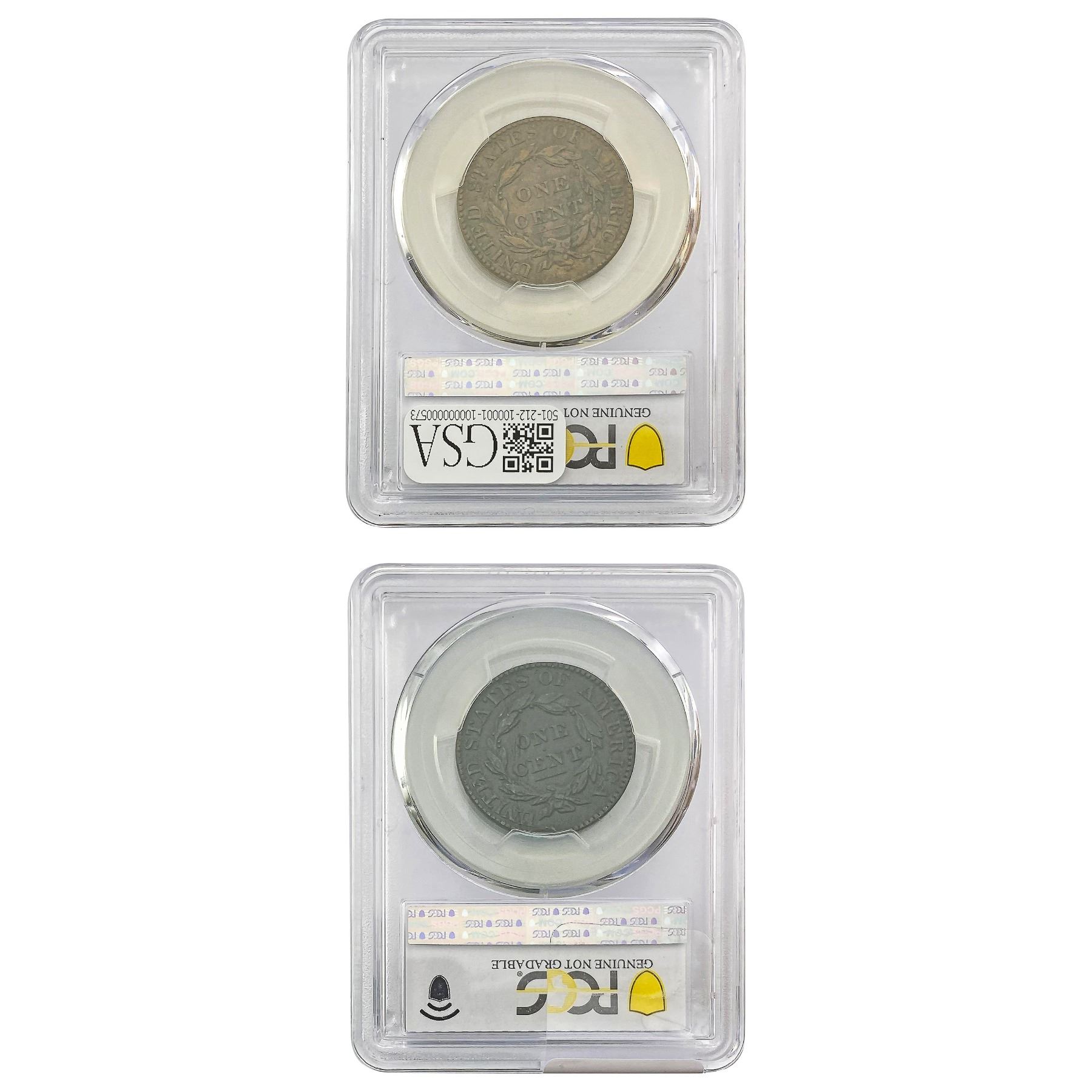 l. All non-certified coins and currency are guaranteed genuine, but are not guaranteed as to grade, since grading is a matter of opinion, an art and not a science, and therefore the description rendered by GSA or any third-party grading service may not agree with the opinion of others (including trained experts), and the same expert may not grade the same item with the same grade at two different times. GSA may, but is not obligated to, express an opinion as to non-certified numismatic items, in GSA’s opinion, or by its employees’ experience and the current interpretation of the American Numismatic Association’s standards as of the date the catalog was prepared. There is no guarantee or warranty expressed or implied that the grading opinions utilized by GSA, if any, will meet the standards of any grading service at any time in the future.