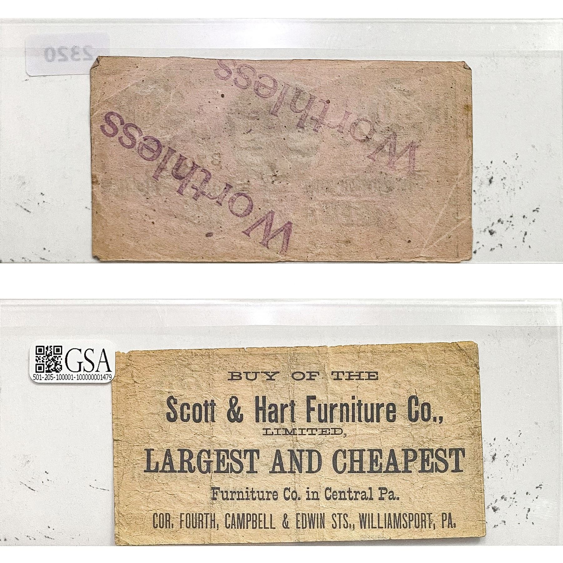 f. Notes sold referencing a third-party grading service are sold “AS IS” without any express or implied warranty, except for guarantee by GSA that they are genuine. Grading, condition or other attributes of any Product may have a material effect on its value and the opinion of others, including third-party grading services such as PCGS Currency and PMG may differ with that of GSA. GSA shall not be bound by any prior or subsequent opinion, determination, or certification by any grading service. Bidders specifically waive any claim to right of return of any Product because of the opinion, determination, or certification, or lack thereof, by any grading service. Certain warranties may be available from the grading services and Bidders are referred to them for further details: Paper Money Guaranty (PMG), PO Box 4711, Sarasota, FL 34230; PCGS Currency, PO Box 10470, Peoria, IL 61612-0470; PCGS Gold Shield, PO Box 9458, Newport Beach, CA 92658. Third-party graded notes are not returnable for any reason whatsoever.