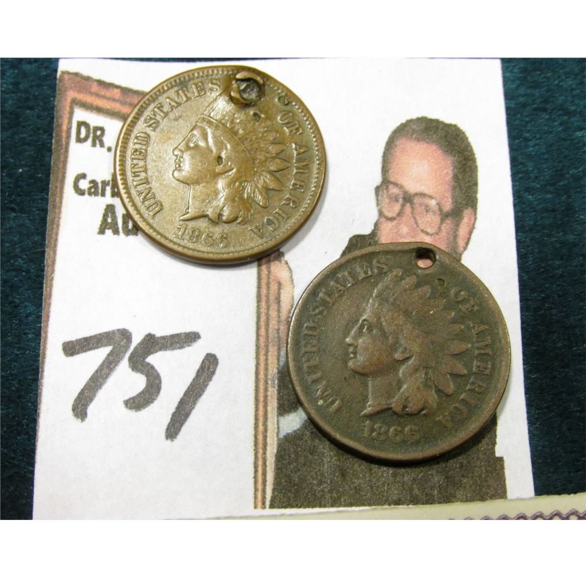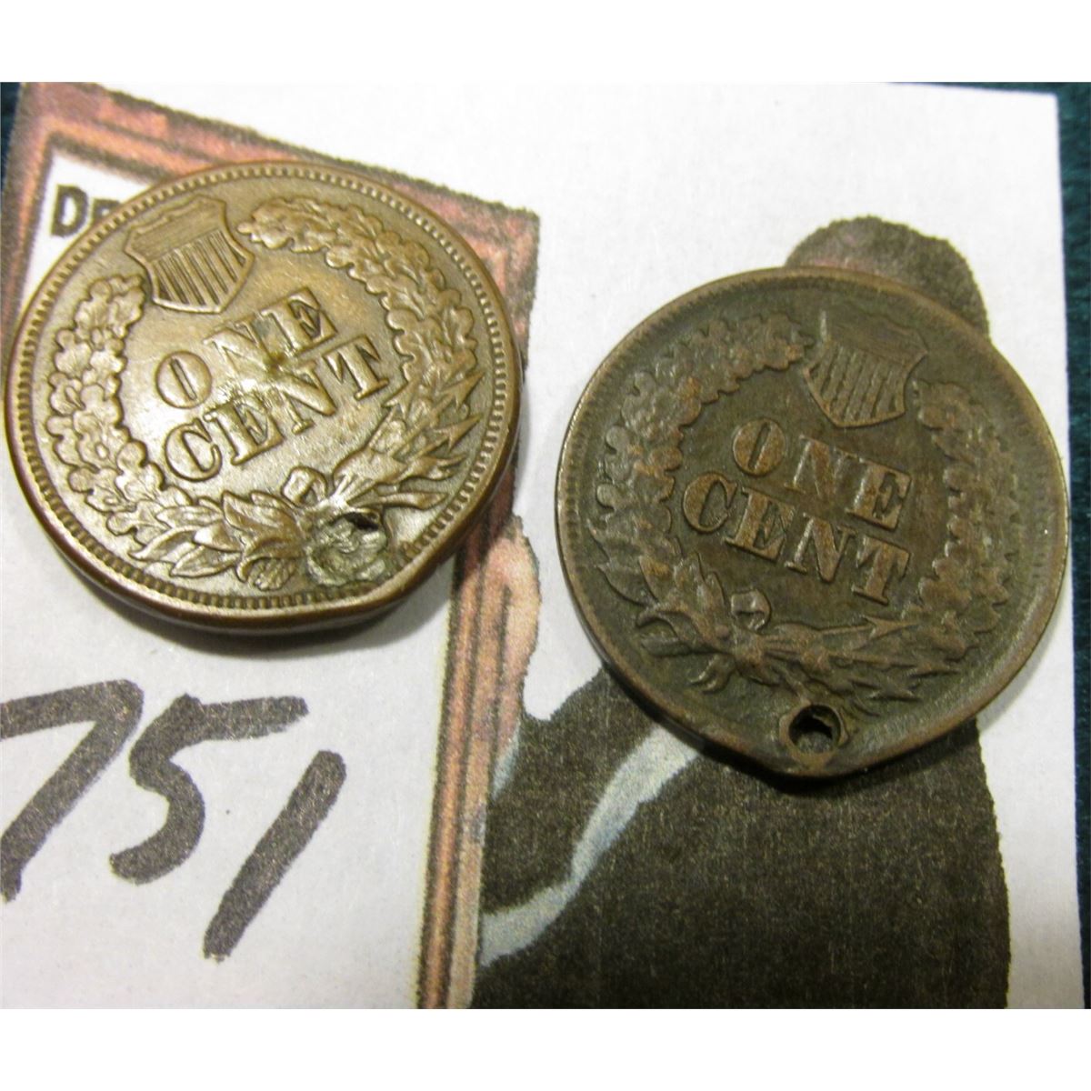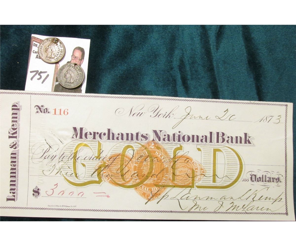 (2) 1866 Indian Head Cents. Both holed; & 1873 "Lanman & Kemp" Check on the "Merchants National Bank Gold" with preprinted Orange 2c Documentary stamp in center, cut cancelled.