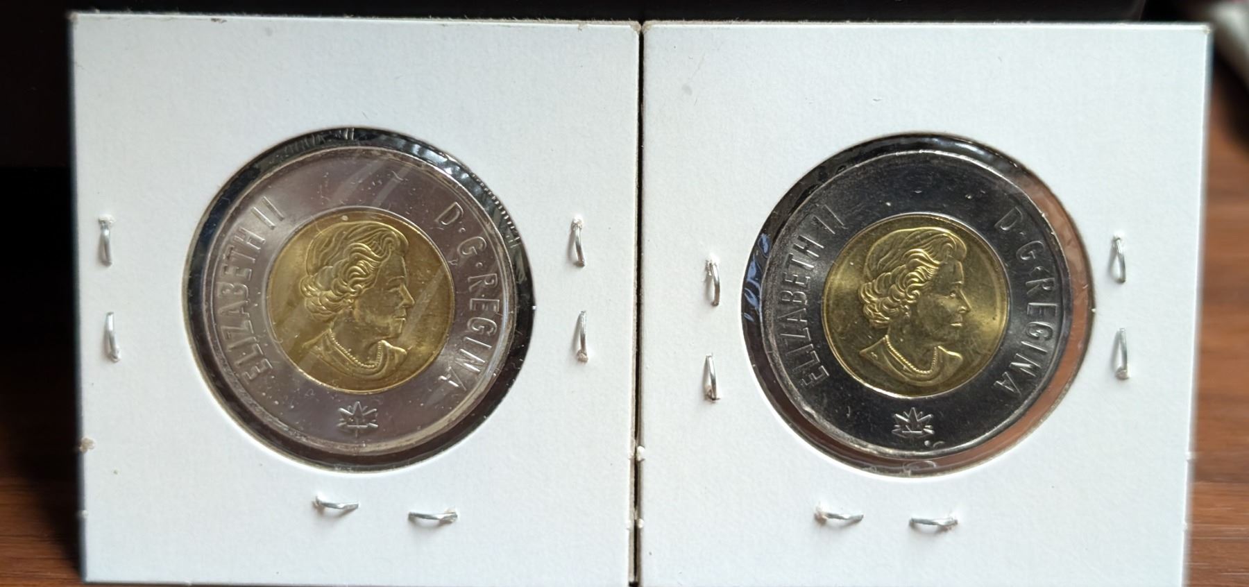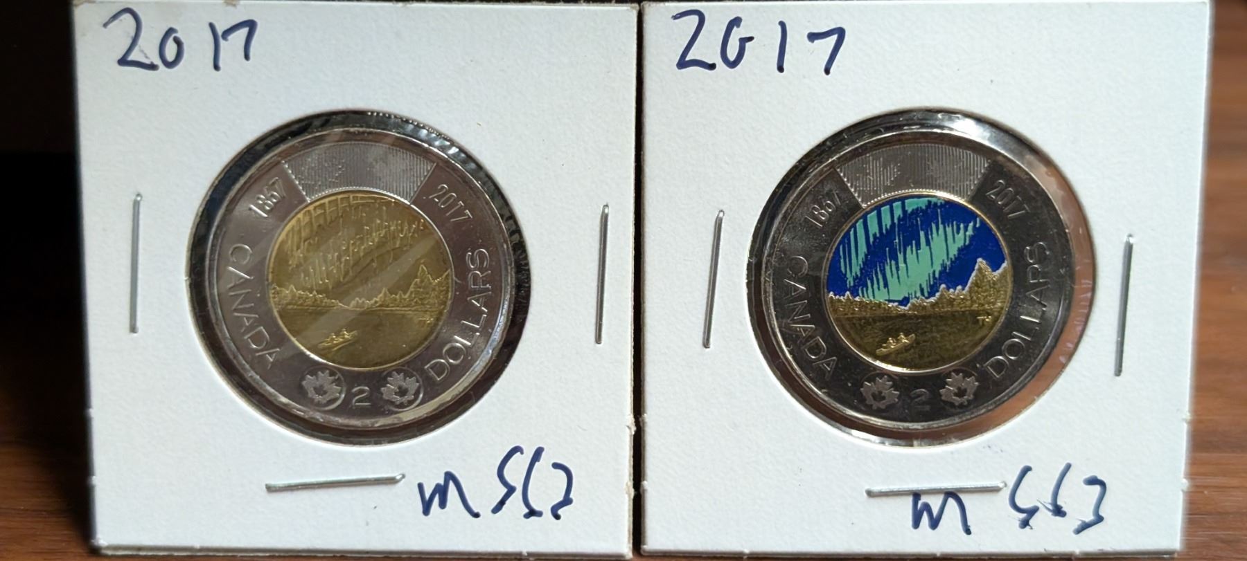 (2) 1867-2017 2 Canadian Dollar Coins, Northern Lights (1) Coloured