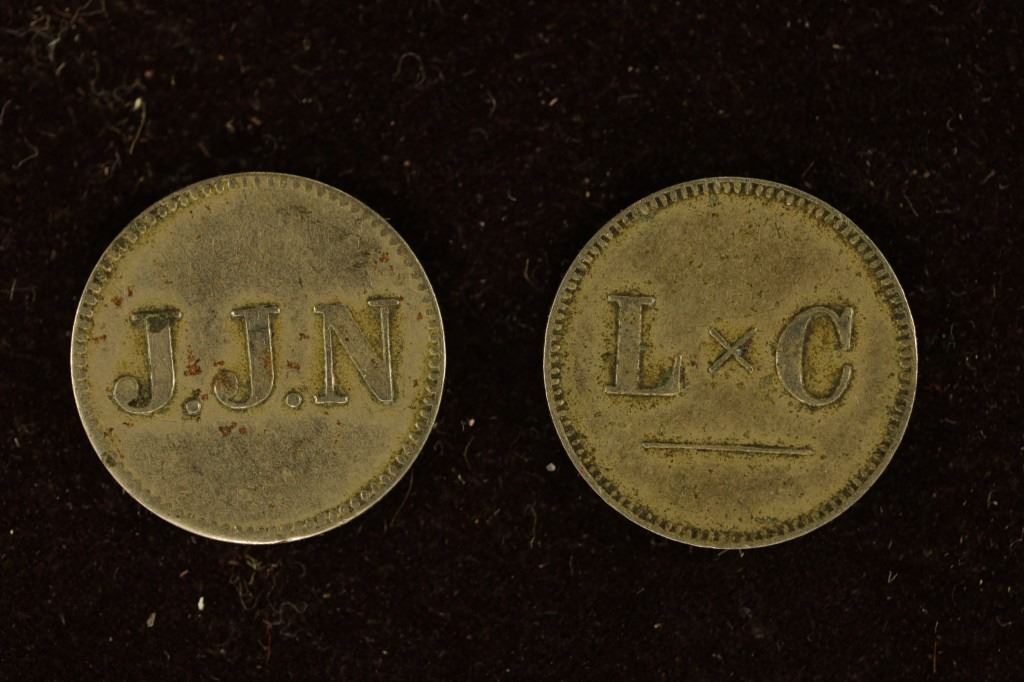 MERCHANT TOKENS. J.J.N (JACOB JEOSUAH NAAR) AND L x C (LEYBA & CO.)