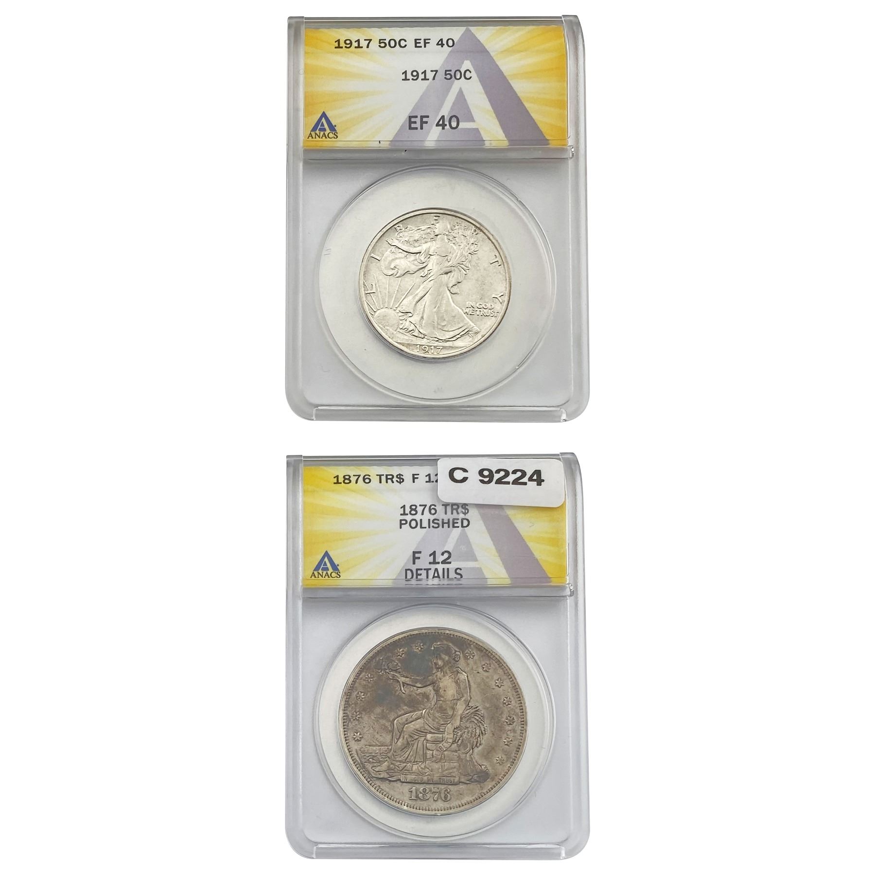 e. Coins sold referencing a third-party grading service are sold “AS IS” without any express or implied warranty, except for a guarantee by GSA that they are genuine. Removal or alteration of the holder, voids all of Bidder’s claims concerning that Product. Certain warranties may be available from the grading services and Bidders are referred to them for further details: Numismatic Guaranty Corporation (NGC), PO Box 4776, Sarasota, FL 34230, www.ngccoin.com/services/writtenguarantee.asp; Professional Coin Grading Services (PCGS), PO Box 9458, Newport Beach, CA 92658, www.pcgs.com/guarantee.html; ANACS, 6555 S. Kenton St., Ste. 303, Englewood, CO 80111; and Independent Coin Grading Co. (ICG), 7901 East Bellview, Ave., Suite 50, Englewood, CO 80111.