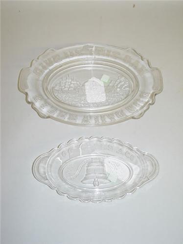 (2) 1876 CENTENNIAL PRESSED GLASS DISHES: (1) 9 1/2" 100 YEARS AGO-LIBERTY BELL OVAL BOWL SERVING DISH & (1) 12 1/2" DAILY BREAD TRAY W/ THE MAYFLOWER & PLYMOUTH ROCK