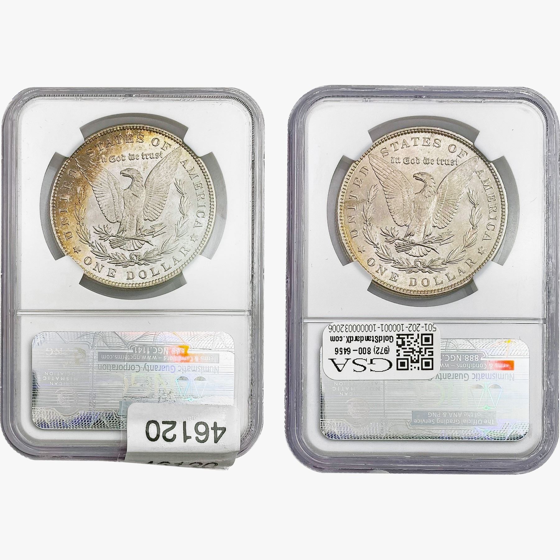 e. Coins sold referencing a third-party grading service are sold “AS IS” without any express or implied warranty, except for a guarantee by GSA that they are genuine. Removal or alteration of the holder, voids all of Bidder’s claims concerning that Product. Certain warranties may be available from the grading services and Bidders are referred to them for further details: Numismatic Guaranty Corporation (NGC), PO Box 4776, Sarasota, FL 34230, www.ngccoin.com/services/writtenguarantee.asp; Professional Coin Grading Services (PCGS), PO Box 9458, Newport Beach, CA 92658, www.pcgs.com/guarantee.html; ANACS, 6555 S. Kenton St., Ste. 303, Englewood, CO 80111; and Independent Coin Grading Co. (ICG), 7901 East Bellview, Ave., Suite 50, Englewood, CO 80111.
