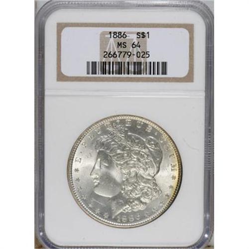 <B>(2)1886 S$1 MS64 NGC.</B></I> NGC Census: (37204/20096). PCGS Population (28692/14146). Mintage: 19,963,886. Numismedia Wsl. Price for NGC/PCGS coin in MS64: $44. (#7166)<BR><BR><b>Shipping:</b> Coins & Currency (<a target="_blank" href="http://www.heritageauctions.com/common/shipping.php">view shipping information</a>)