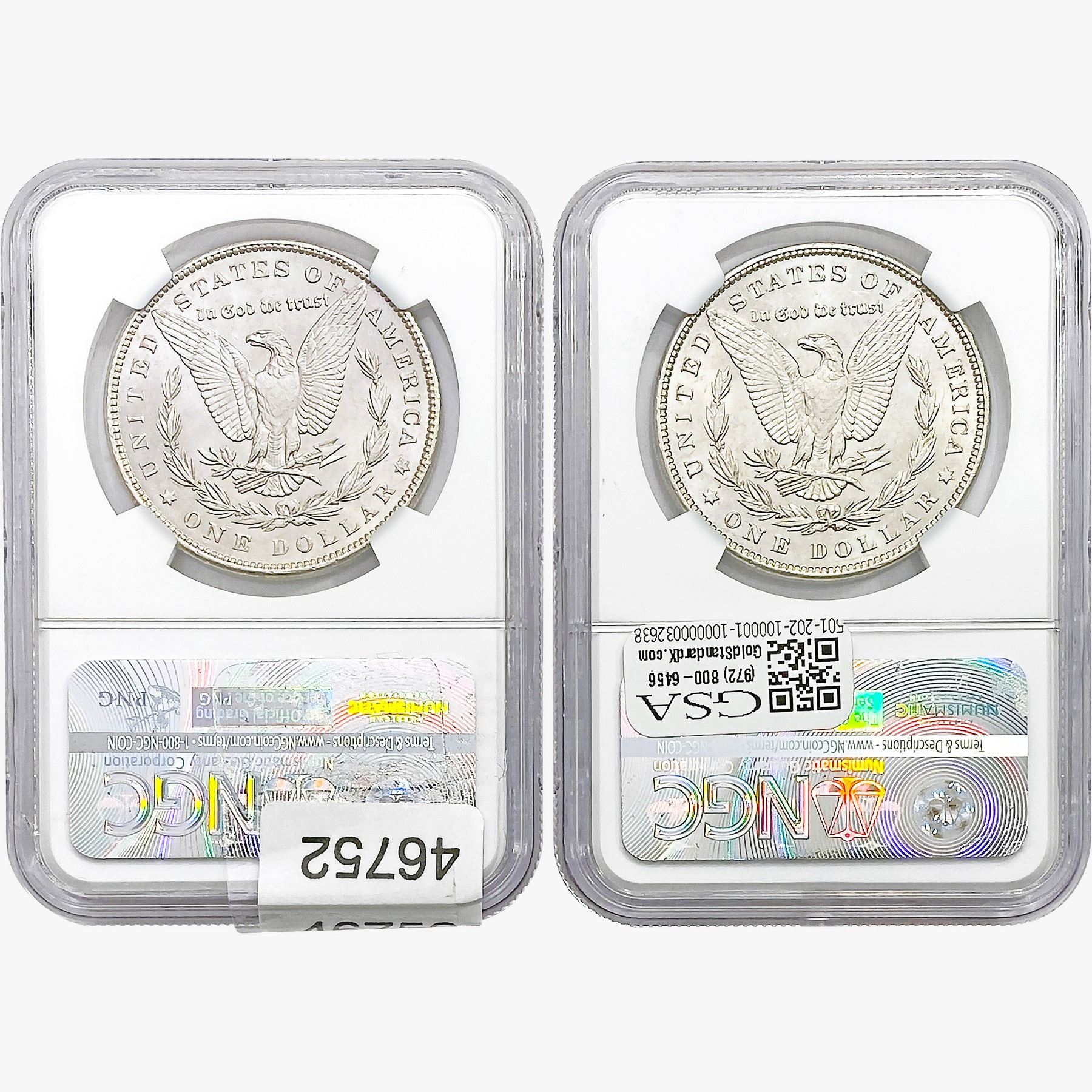 e. Coins sold referencing a third-party grading service are sold “AS IS” without any express or implied warranty, except for a guarantee by GSA that they are genuine. Removal or alteration of the holder, voids all of Bidder’s claims concerning that Product. Certain warranties may be available from the grading services and Bidders are referred to them for further details: Numismatic Guaranty Corporation (NGC), PO Box 4776, Sarasota, FL 34230, www.ngccoin.com/services/writtenguarantee.asp; Professional Coin Grading Services (PCGS), PO Box 9458, Newport Beach, CA 92658, www.pcgs.com/guarantee.html; ANACS, 6555 S. Kenton St., Ste. 303, Englewood, CO 80111; and Independent Coin Grading Co. (ICG), 7901 East Bellview, Ave., Suite 50, Englewood, CO 80111.