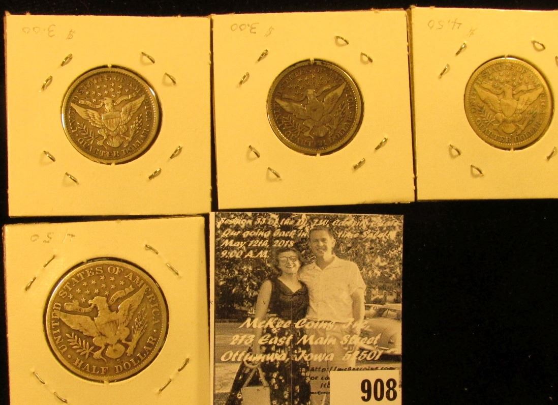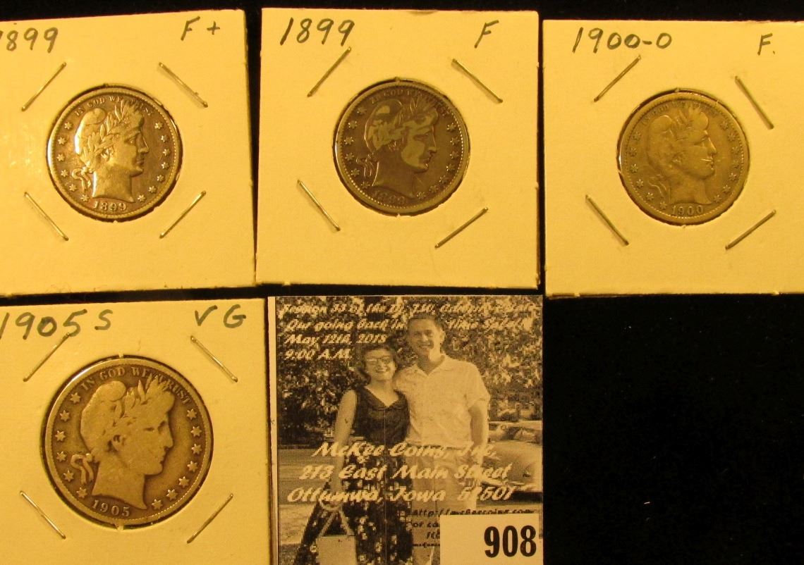 (2) 1899 P both Fine, & 1900 O Fine Barber Quarters; & 1905 S Barber Half Dollar, VG.