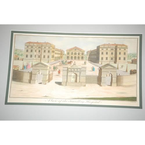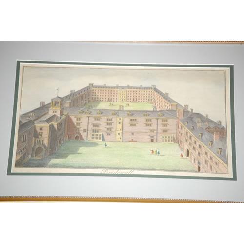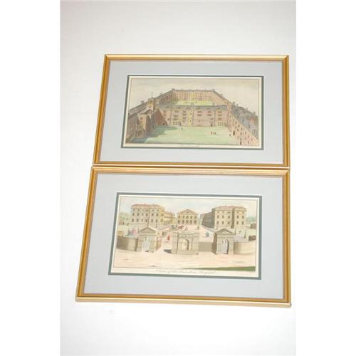 (2) 18TH CENT. COLORED ENGRAVINGS - (2) 18TH CENT. ENGRAVINGS OF BRITISH INSTITUTIONAL ARCHITECTURE W/ PEOPLE IN THE LANDSCAPE: (1) "A VIEW OF THE FOUNDLING HOSPITAL" & (1) "BRIDEWELL"-MATTED IN GILT FRAMES (EA. 8 1/2" X 13 1/4") - LIGHT TONING