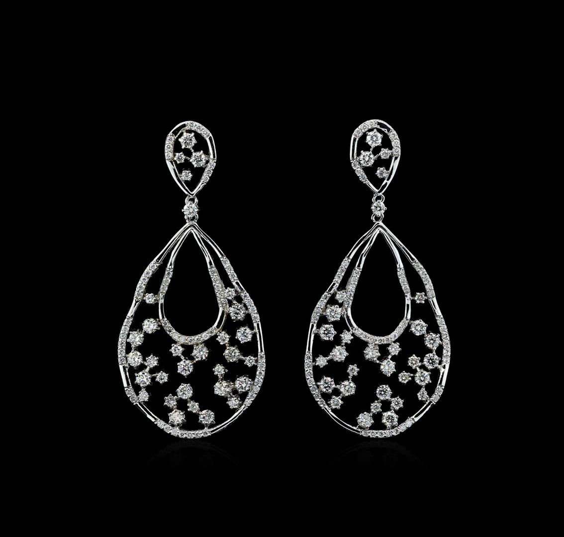 One pair electronically tested 14KT white gold lady's cast fashion dangle earrings with friction posts with a bright polish finish. The featured lady's earrings have a drop of 52 millimeters. Identified with markings of '585'. Condition is new, good workmanship. Containing: Thirty-Four prong set round brilliant cut diamonds, measuring 2.40 - 2.30 x 1.41mm (depth est.) approximate total weight of 34 Stones = 1.62ct. Graded in the setting. Clarity VS-2 to SI-2. Color: H - I Cut Good Twenty-Eight prong set round brilliant cut diamonds, measuring 1.80 - 1.70 x 1.07mm (depth est.) approximate total weight of 28 Stones = 0.57ct. Graded in the setting. Clarity SI-1 to SI-2. Color: H - I Cut Good One Hundred Eighteen prong set round brilliant cut diamonds, measuring 1.20 - 1.15 x 0.73mm (depth est.) approximate total weight of 118 Stones = 0.72ct. Graded in the setting. Clarity SI-1 to I-1. Color: H - I Cut Good. Total Weight of Diamonds 2.91ct.. Total Weight of Earrings 13.20gm GAS Appraised at $8,810.00.
