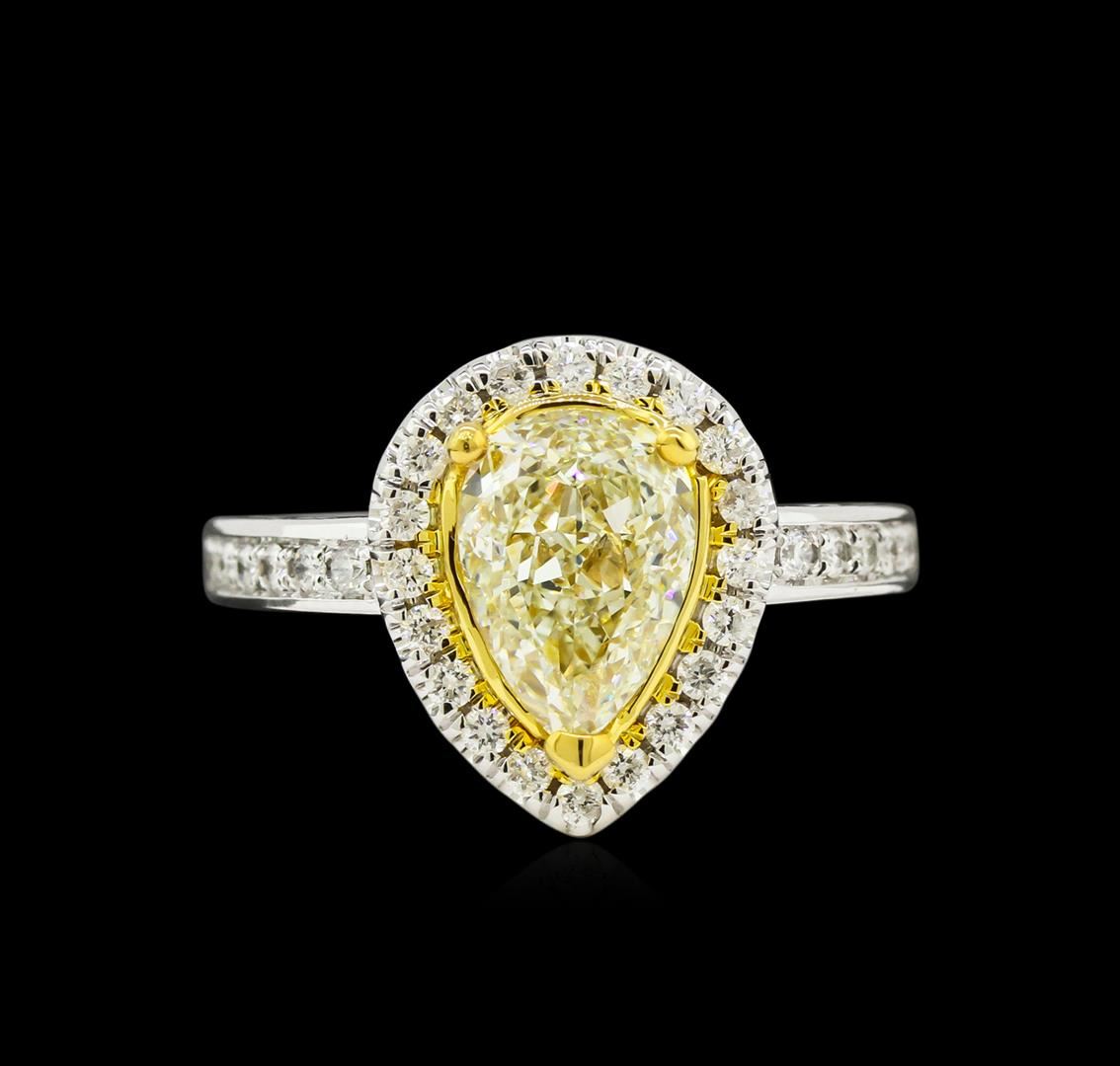One electronically tested 14KT white and yellow gold lady's combination cast & assembled wedding ring with a cathedral shank with a halo with a bright polish finish. The featured lady's ring has a shank measuring 2.33 millimeters wide. Identified with markings of "14K". Condition is new, good workmanship. Containing: One prong set pear shaped cut diamond, measuring 9.58 x 6.52 x 4.45mm (depth est.) , 10.00.%. GTCF approximate weight of 1.83ct. Graded in the setting. Clarity: VS-1 Cut Very Good Thirty-Four prong set round brilliant cut diamonds, measuring 1.40 - 1.35 x 0.88mm (depth est.) approximate total weight of 34 Stones = 0.36ct. Graded in the setting. Clarity: SI-1 to I-1. Color: G - I. Cut Good. Total Weight of Diamonds 2.19ct. Total Weight of Ring 5.40gm. GAS Appraised at $18,060.00.