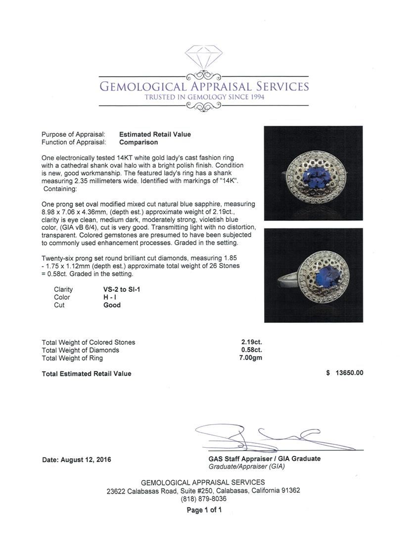 One electronically tested 14KT white gold lady's cast fashion ring with a cathedral shank oval halo with a bright polish finish. The featured lady's ring has a shank measuring 2.35 millimeters wide. Identified with markings of '14K'. Condition is new, good workmanship. Containing: One prong set oval modified mixed cut natural blue sapphire, measuring 8.98 x 7.06 x 4.36mm, (depth est.) approximate weight of 2.19ct., clarity is eye clean, medium dark, moderately strong, violetish blue color, (GIA vB 6/4), cut is very good. Transmitting light with no distortion, transparent. Colored gemstones are presumed to have been subjected to commonly used enhancement processes. Graded in the setting. Twenty-Six prong set round brilliant cut diamonds, measuring 1.85 - 1.75 x 1.12mm (depth est.) approximate total weight of 26 Stones = 0.58ct. Graded in the setting. Clarity VS-2 to SI-1. Color: H - I Cut Good. Total Weight of Colored Stones 2.19ct.. Total Weight of Diamonds 0.58ct.. Total Weight of Ring 7.00gm. GAS Appraised at $13,650.00.