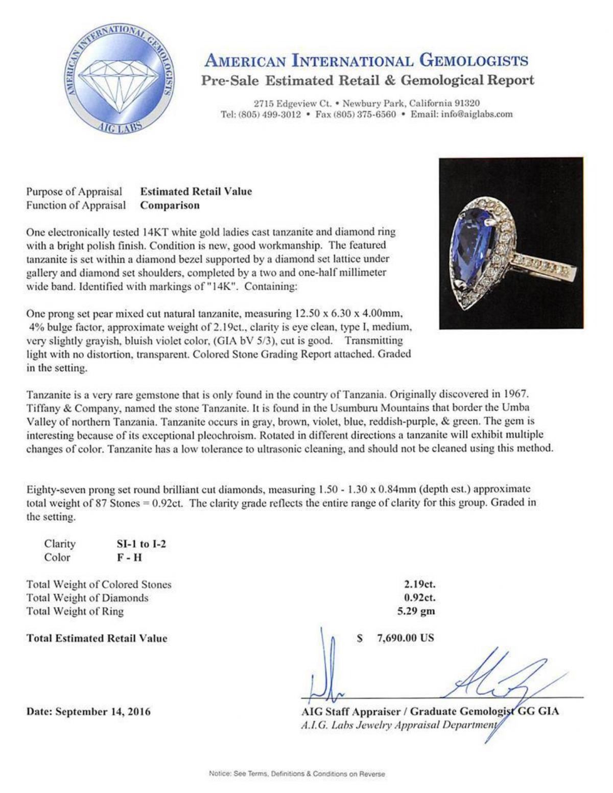 One electronically tested 14KT white gold ladies cast tanzanite and diamond ring with a bright polish finish. The featured tanzanite is set within a diamond bezel supported by a diamond set lattice under gallery and diamond set shoulders, completed by a two and one-half millimeter wide band. Identified with markings of '14K'. Condition is new, good workmanship. Containing: One prong set pear mixed cut natural tanzanite, measuring 12.50 x 6.30 x 4.00mm, 4%. bulge factor, approximate weight of 2.19ct., clarity is eye clean, type I, medium, very slightly grayish, bluish violet color, (GIA bV 5/3), cut is good. Transmitting light with no distortion, transparent. Colored Stone Grading Report attached. Graded in the setting. Tanzanite is a very rare gemstone that is only found in the country of Tanzania. Originally discovered in 1967. Tiffany & Company, named the stone Tanzanite. It is found in the Usumburu Mountains that border the Umba Valley of northern Tanzania. Tanzanite occurs in gray, brown, violet, blue, reddish-purple, & green. The gem is interesting because of its exceptional pleochroism. Rotated in different directions a tanzanite will exhibit multiple changes of color. Tanzanite has a low tolerance to ultrasonic cleaning, and should not be cleaned using this method. Eighty-Seven prong set round brilliant cut diamonds, measuring 1.50 - 1.30 x 0.84mm (depth est.) approximate total weight of 87 Stones = 0.92ct. The clarity grade reflects the entire range of clarity for this group. Graded in the setting. Clarity SI-1 to I-2. Color: F - H. Total Weight of Colored Stones 2.19ct.. Total Weight of Diamonds 0.92ct.. Total Weight of Ring 5.29gm. AIG Appraised.