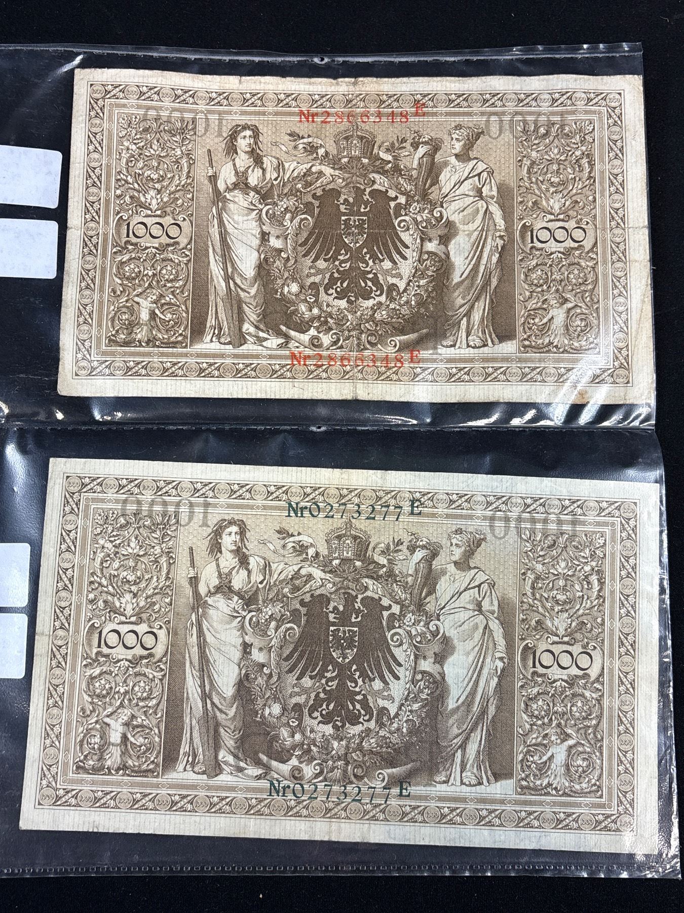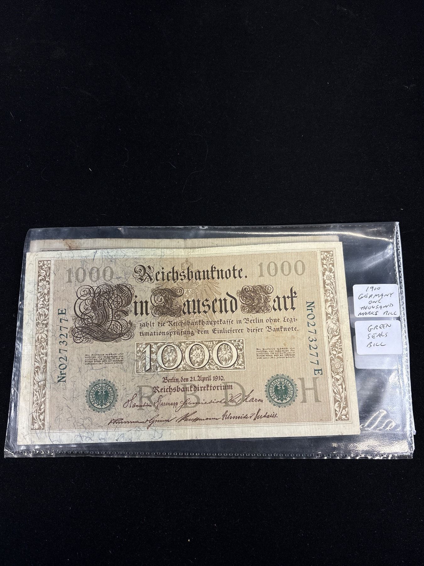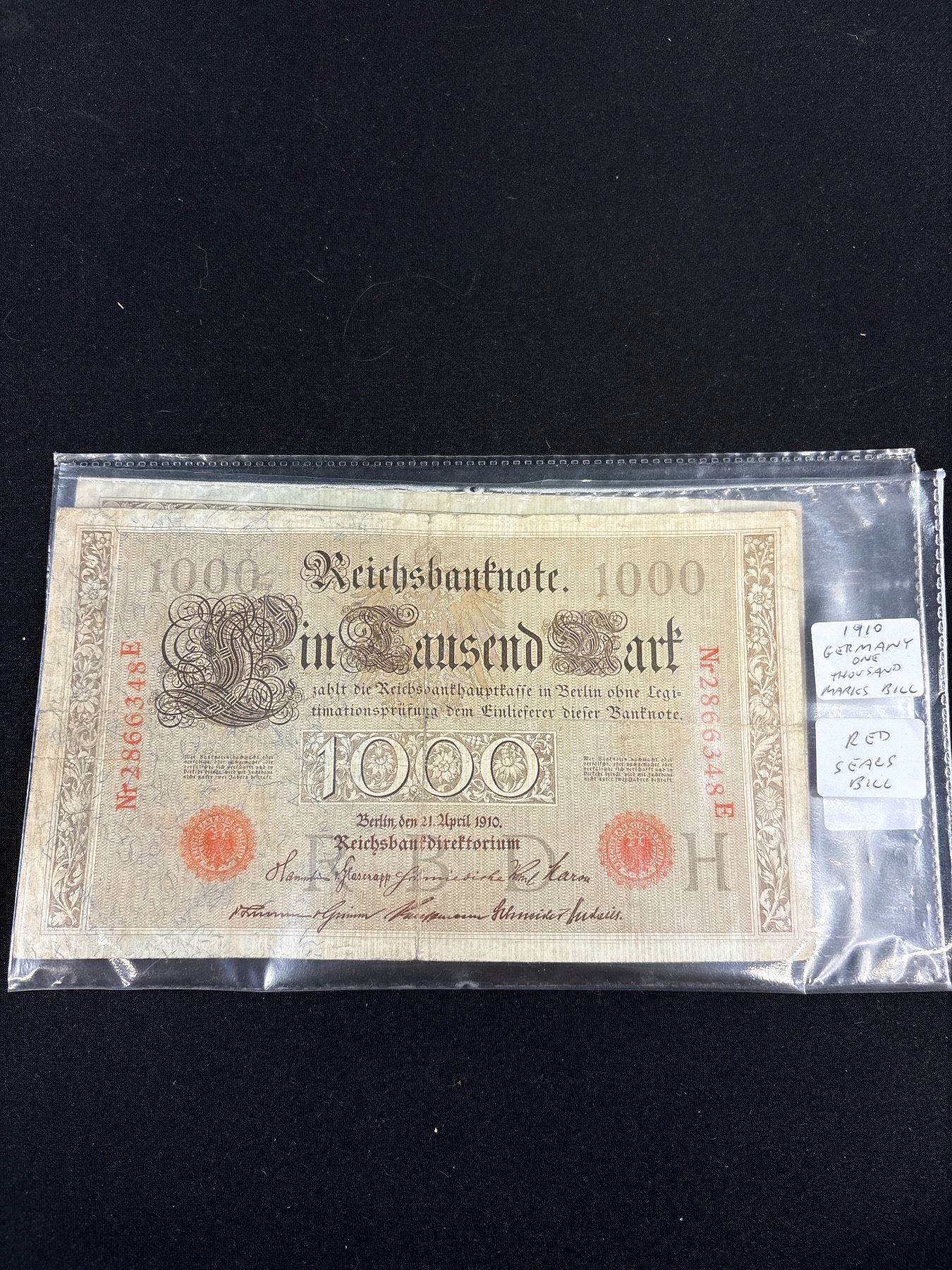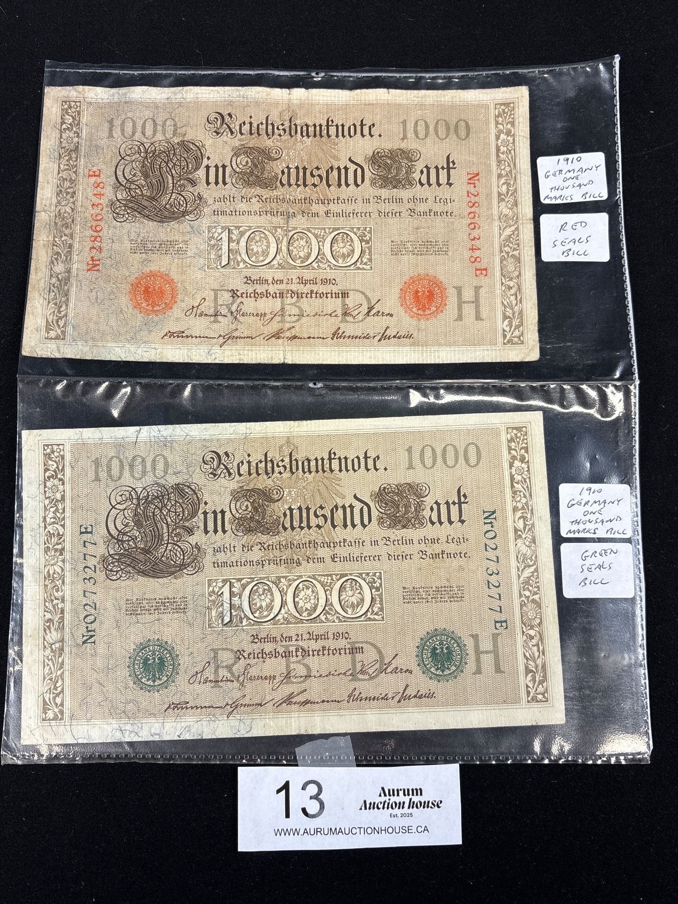 2 1910 German Bank Notes, 1 w/ Red Seal, Other w/ Green Seal