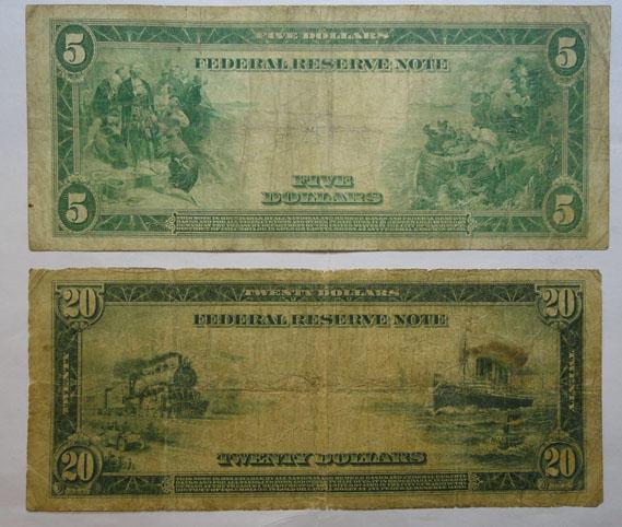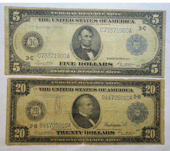 2 1914 FRN--$5 fine and $20 VG lite #18 written on front