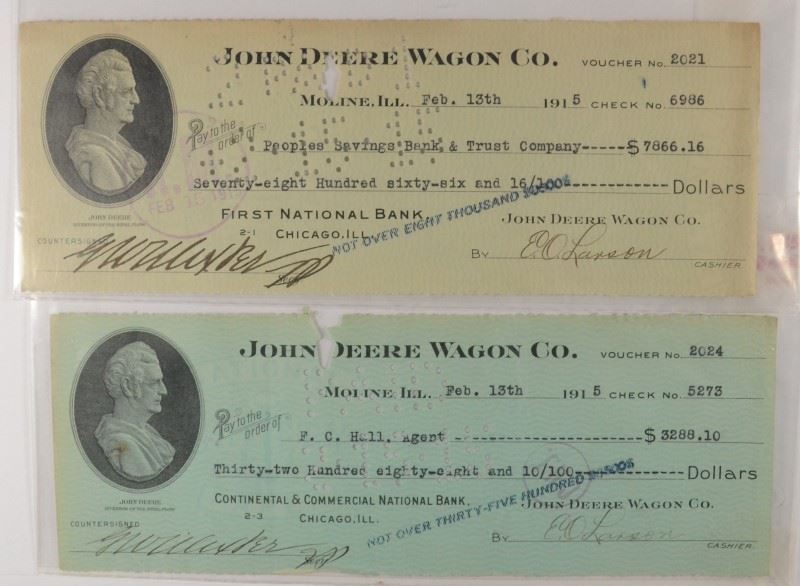 2 - 1915 JOHN DEERE BANK CHECKS, FIRST NATL & CONTINENTAL & COMMERCIAL BANKS