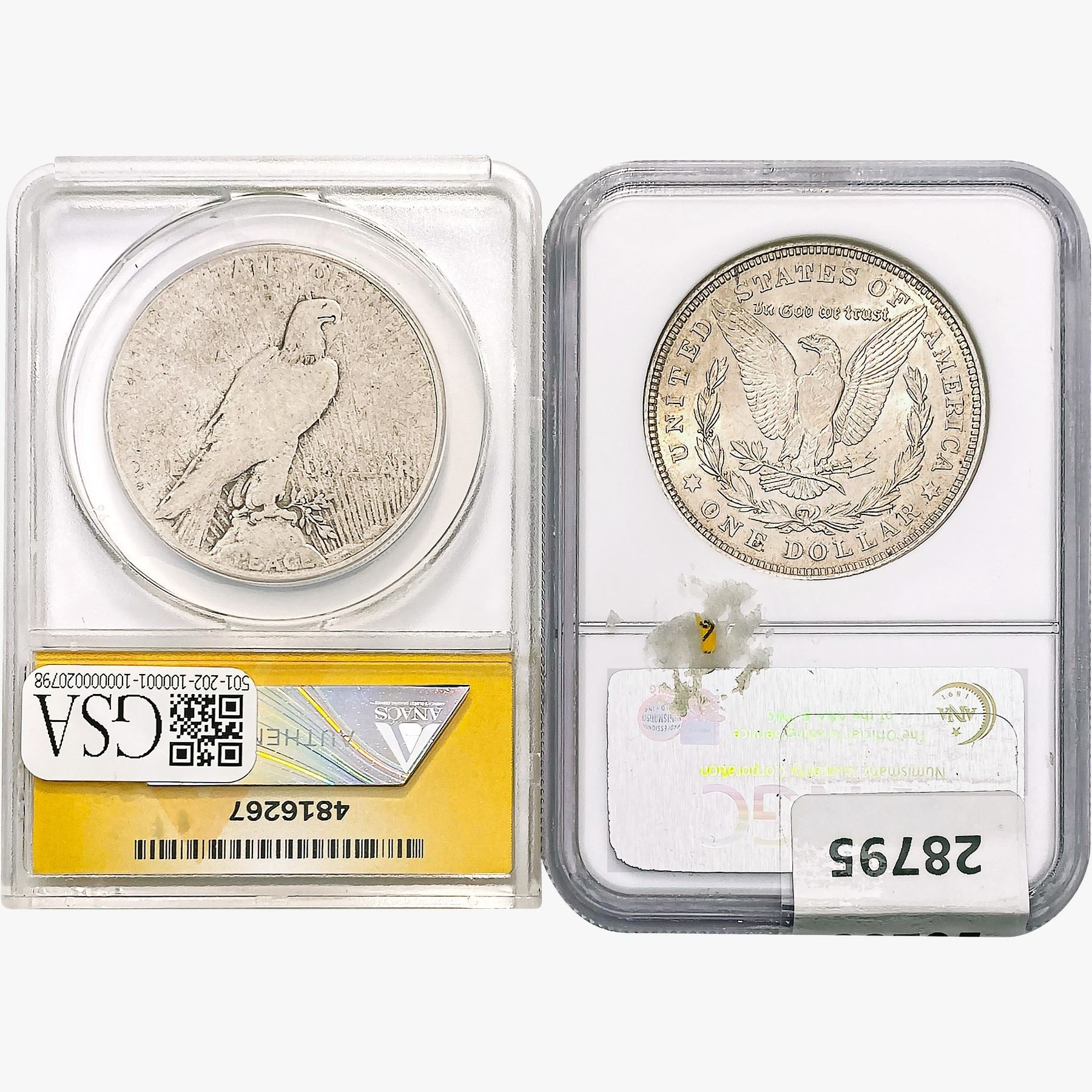 h. Since GSA cannot examine encapsulated coins or notes, they are sold “AS IS” without GSA’s grading opinion, and may not be returned for any reason. GSA shall not be liable for any patent or latent defect or controversy pertaining to or arising from any encapsulated Product. In any such instance, Bidder’s remedy, if any, shall be solely against the service certifying the Product.