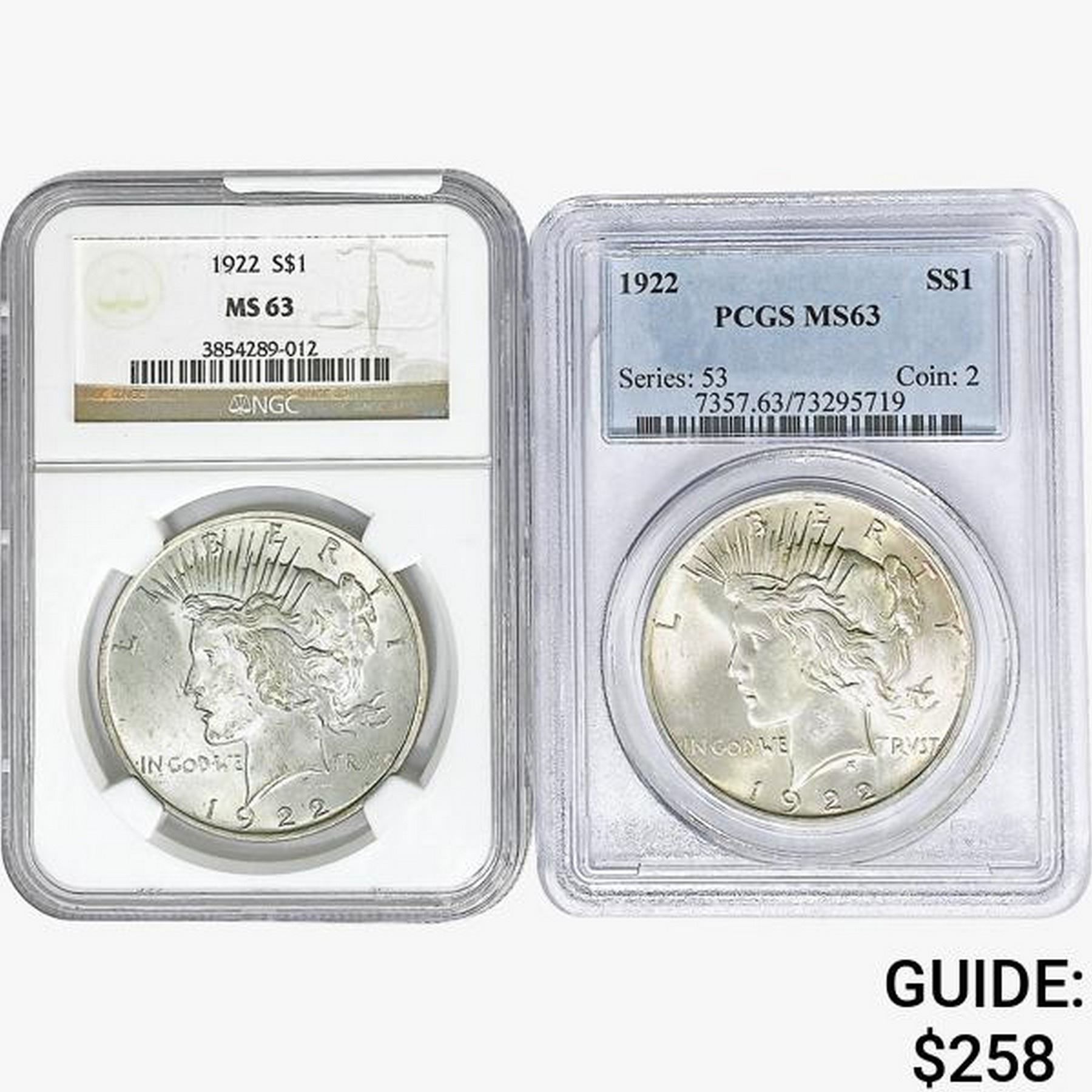 [2] 1922 Silver Peace Dollar NGC/PCGS MS63