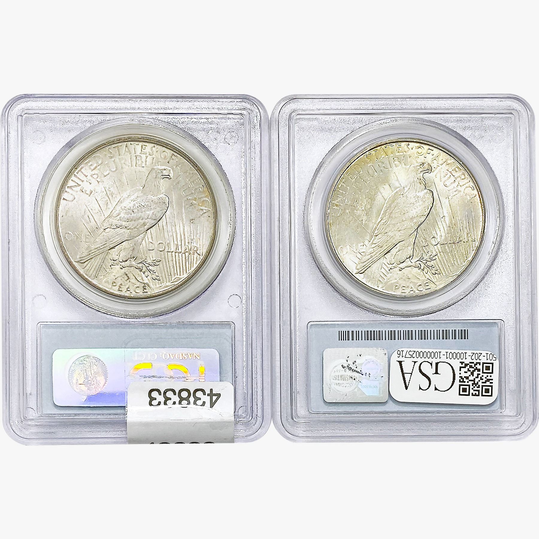 COINS AND CURRENCY LISTED IN GSA’S CATALOG AS GRADED AND ENCAPSULATED BY PCGS, NGC, ANACS, ICG, PCGS CURRENCY, PMG, PCGS BANKNOTE GRADING, CMC OR ANY OTHER THIRD-PARTY GRADING SERVICE ARE LIKEWISE SOLD “AS-IS” EXCEPT AS EXPRESSLY SET FORTH HEREIN. ALL THIRD-PARTY GRADING SERVICE GUARANTEES, INCLUDING AUTHENTICITY, ARE THE SOLE RESPONSIBILITY OF THE THIRD-PARTY GRADING SERVICE AND NOT WARRANTIES OR GUARANTEES OF GSA. BIDDERS SHOULD CONTACT THESE THIRD-PARTY GRADING SERVICES DIRECTLY WITH RESPECT TO ANY CLAIMS OR QUESTIONS THEY MAY HAVE CONCERNING THEIR GUARANTEES AND WARRANTIES. BIDDERS ACKNOWLEDGE AND AGREE THAT AUCTIONEER IS NOT BOUND BY OR LIABLE FOR ANY OPINION OR CERTIFICATION BY ANY THIRD-PARTY GRADING SERVICE. REMOVAL OF A PRODUCT FROM ITS PROTECTIVE CASING OR HOLDER OR ALTERATION OF ANY COIN HOLDER WAIVES ALL RIGHTS CONCERNING THE PRODUCT CONTAINED THEREIN.